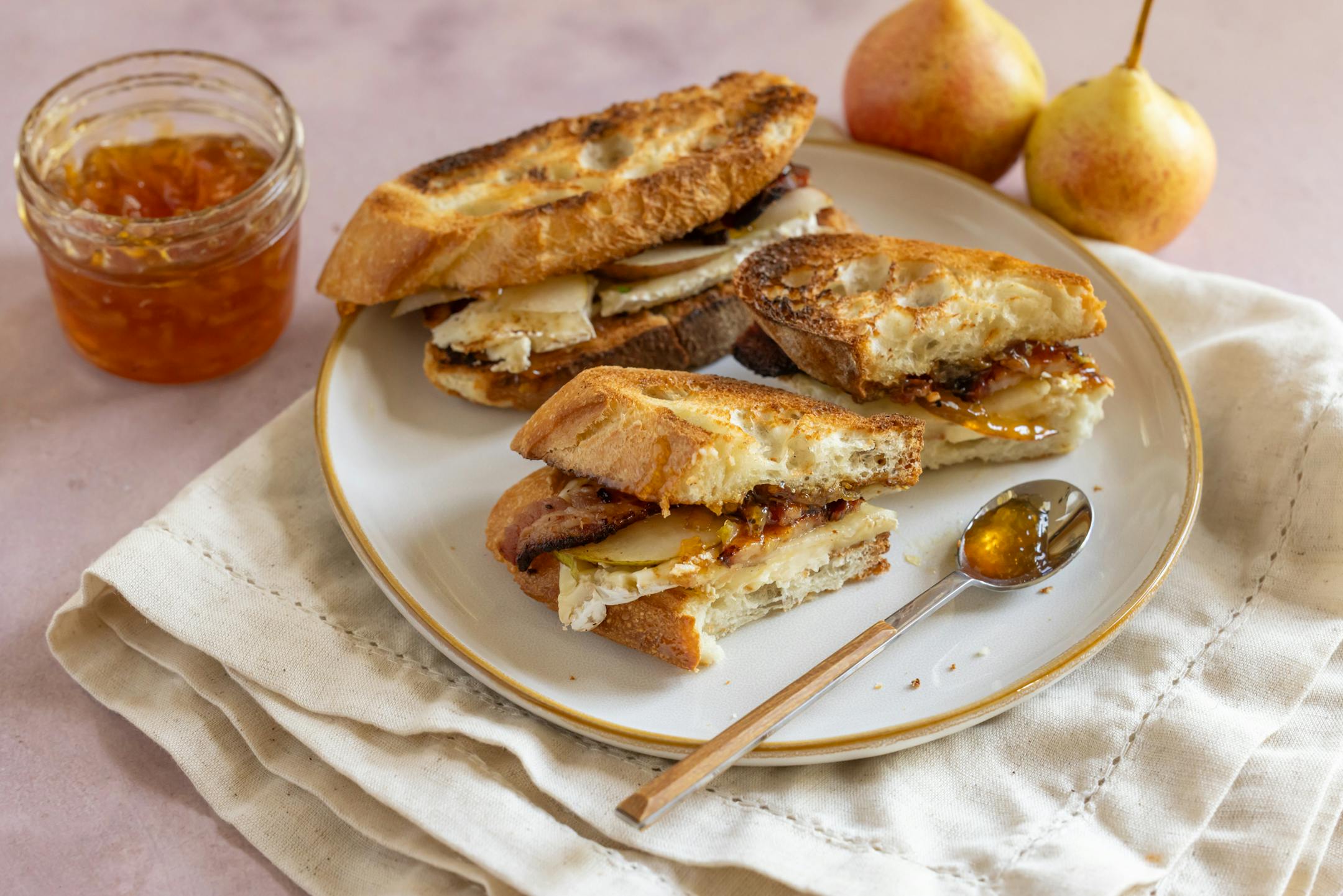 Start with great bread with slices you’d like to enjoy on their own. Toasting can improve the flavor and texture if it’s in danger of becoming soggy. Choose ingredients with contrasting textures and tastes. How about sharp Cheddar cheese, bacon and snappy apples griddled to a golden fare-thee-well? Or funky brie, bacon and mellow sweet pear on a toasted baguette?