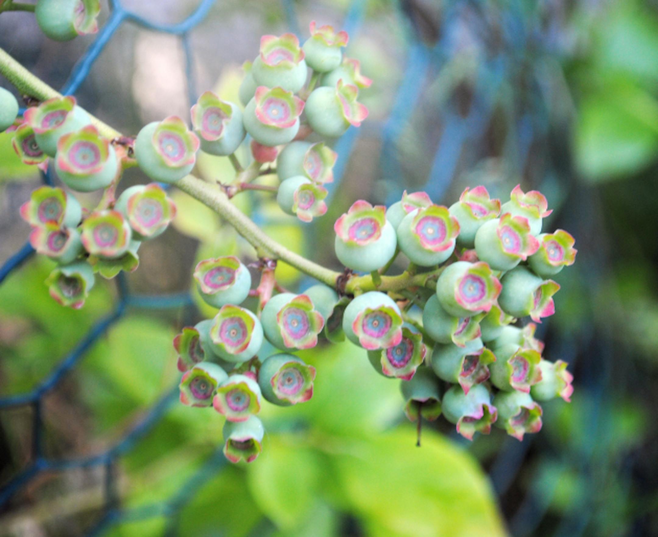 It's still spring in the garden, both by the calendar and by its progress. Among my favorite pastimes right now is spotting buds of promise. First it's the tightly wound rose buds, not yet revealing any hint of color that they'll later unfurl. Then it's the yellow flowers of hope: tomatoes in the making. And lately, it's the blessings of future blueberries. My favorite stage -- until they're ripe -- is right now, when the lace-edged balls turn almost aqua, with rings of fuchsia surrounding a slightly deeper shade of blue. Soon it will be time to spread the netting to protect them from hungry visitors.