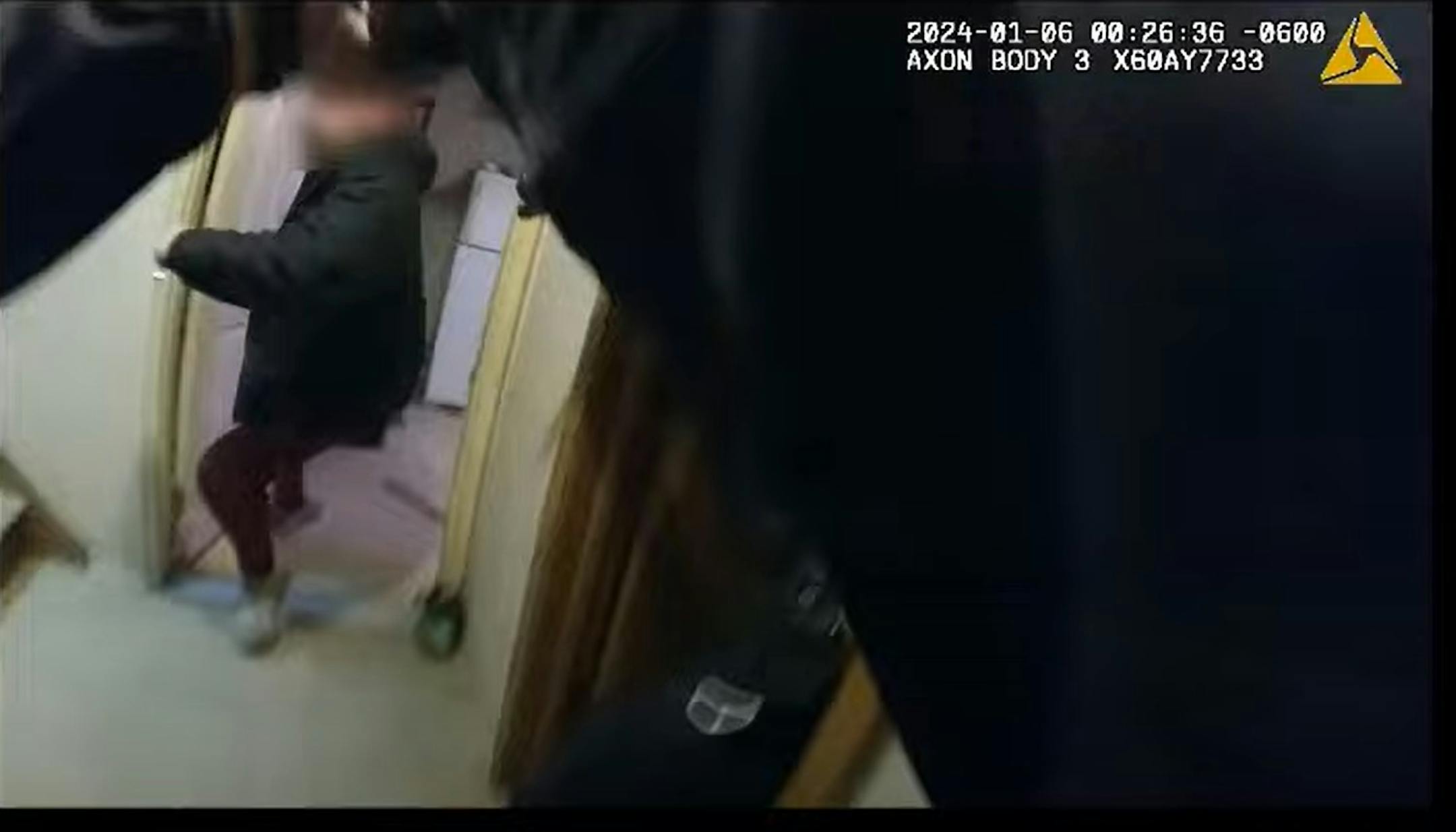 Reschke has his gun pointed into the apartment while Needham waits in the hallway and instructs Fraser several times to come out slowly with his hands up. He tells Needham he can't see Fraser. The videos show both officers back up as Fraser runs out from the apartment into the hallway towards them, with Reschke yelling, "He's got something!"