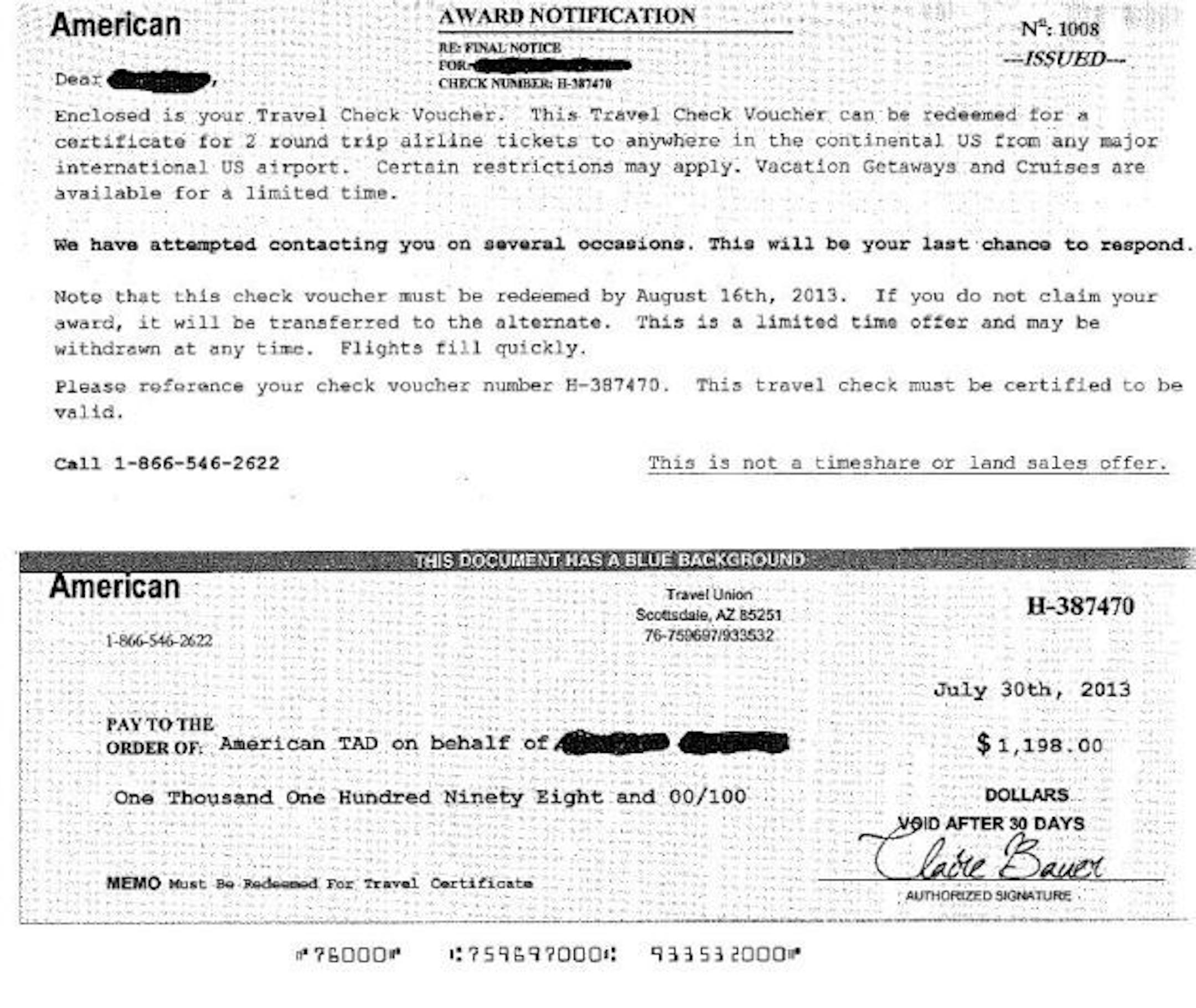 The letter, which states this is a "final notice," informs recipients that American TAD has been attempting to contact them on several occasions."Enclosed is your Travel Check Voucher. This Travel Check Voucher can be redeemed for a certificate for 2 round trip airline tickets anywhere in the continental US from any major international US airport," the letter says.