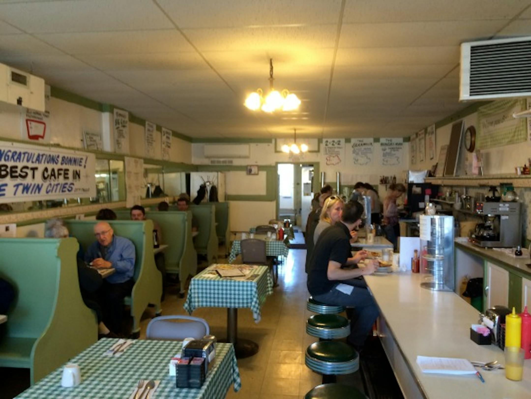 It's a loss. Compared with the Twin Cities' increasingly slick dining-out scene, cozy, no-nonsense Bonnie's is a happy throwback, the kind of welcoming environment where a cheerfully tinkling bell greets customers as they walk through the front door, where green vinyl-covered stools flank a counter topped with gold-flecked white linoleum, where the well-worn wooden booths let out a creaky sigh when diners slip into them, where a chalkboard behind the counter enthusiastically extols the virtues of a frosted almond bear claw, and where the menu consists of a series of hand-painted signs covering the walls.