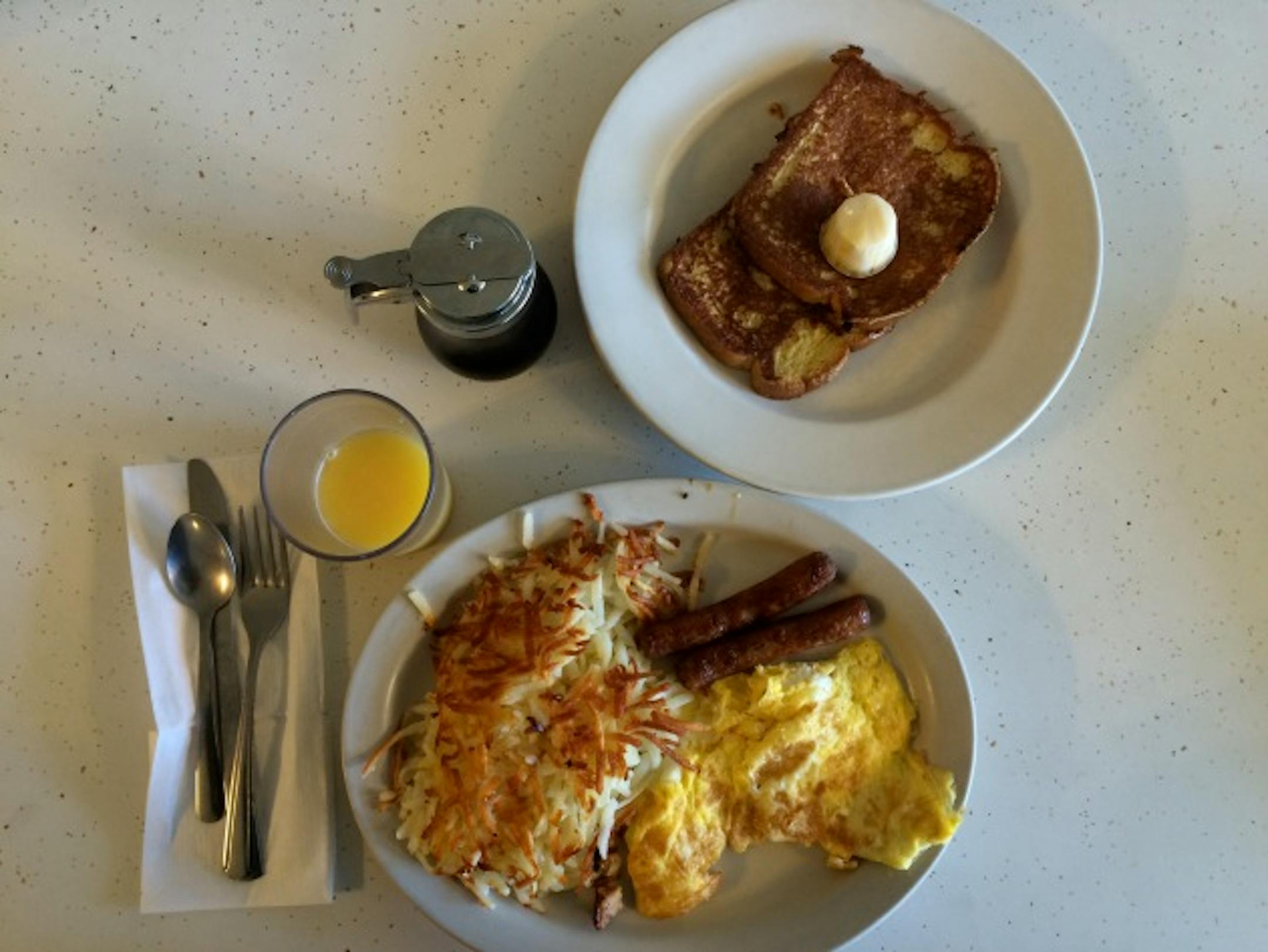 The heaping-helping fare pretty much defines short-order cooking. There's the Hungry Man (an 8-oz. hamburger steak, two eggs and hash browns, for $10.99), the Bonnie's Big Eater (two eggs, two slices of bacon, two sausages, a slice of ham, hash browns and toast, for $9.99) and the 2x2x2 (two slices of French toast, two sausages, hash browns and two eggs, any style, for $8.99), which is pictured above, in all its hot-off-the-griddle glory.