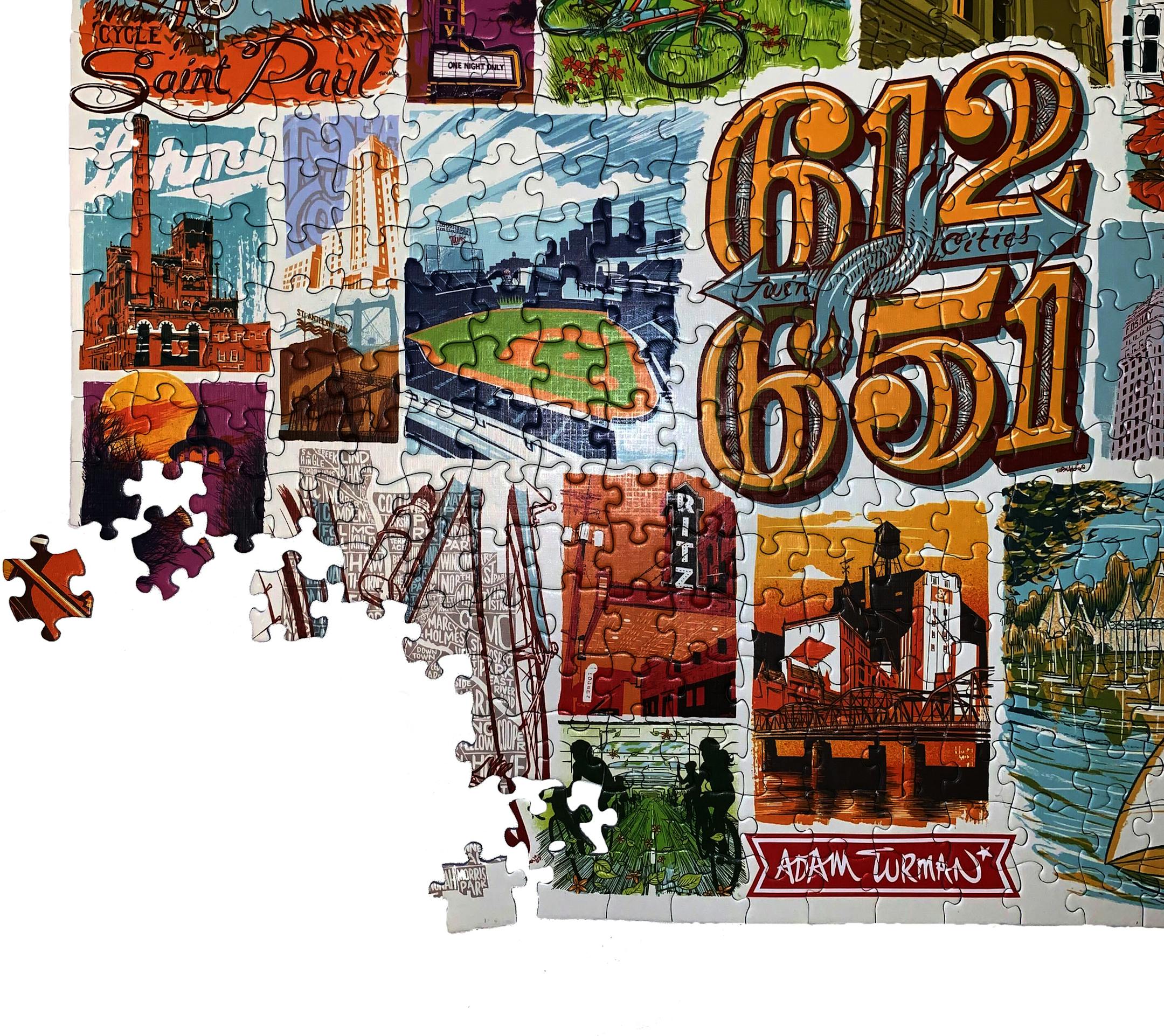Since then, Turman and the Nelsons have collaborated on six different puzzles, including "Moon Over Minneapolis," a stacked cityscape of downtown, "Boundary Waters Canoe Area," a peaceful campsite at sunset, and "MN Abbey Road," with the Hamm's beer bear, Paul Bunyan, Pillsbury Doughboy and the State Fair mascot walking across the Stone Arch Bridge.