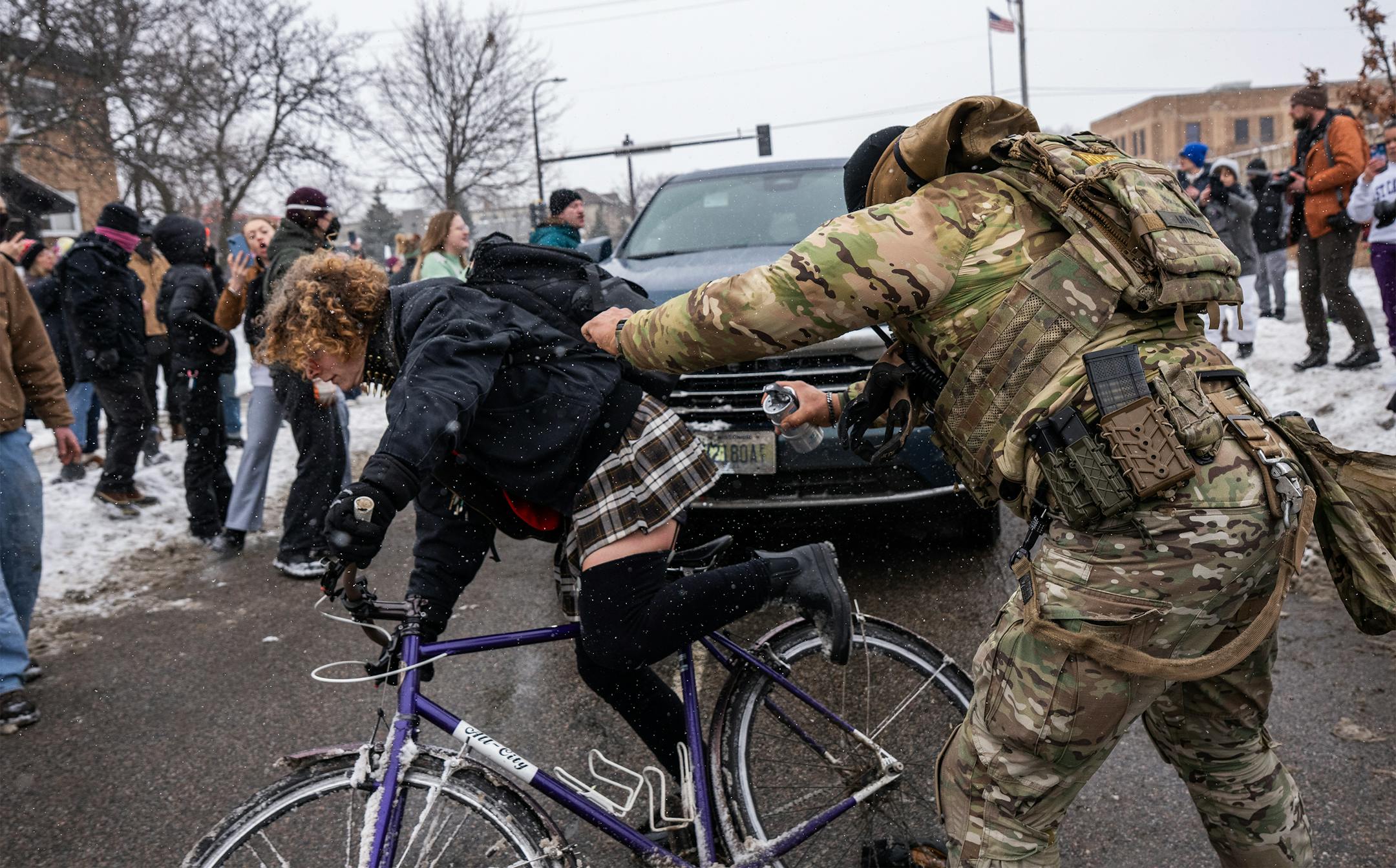 Just a short while earlier and about a mile away, near West 28th Street and Blaisdell Avenue, agents held a person to the ground as they sprayed a bright orange chemical irritant directly into their face.