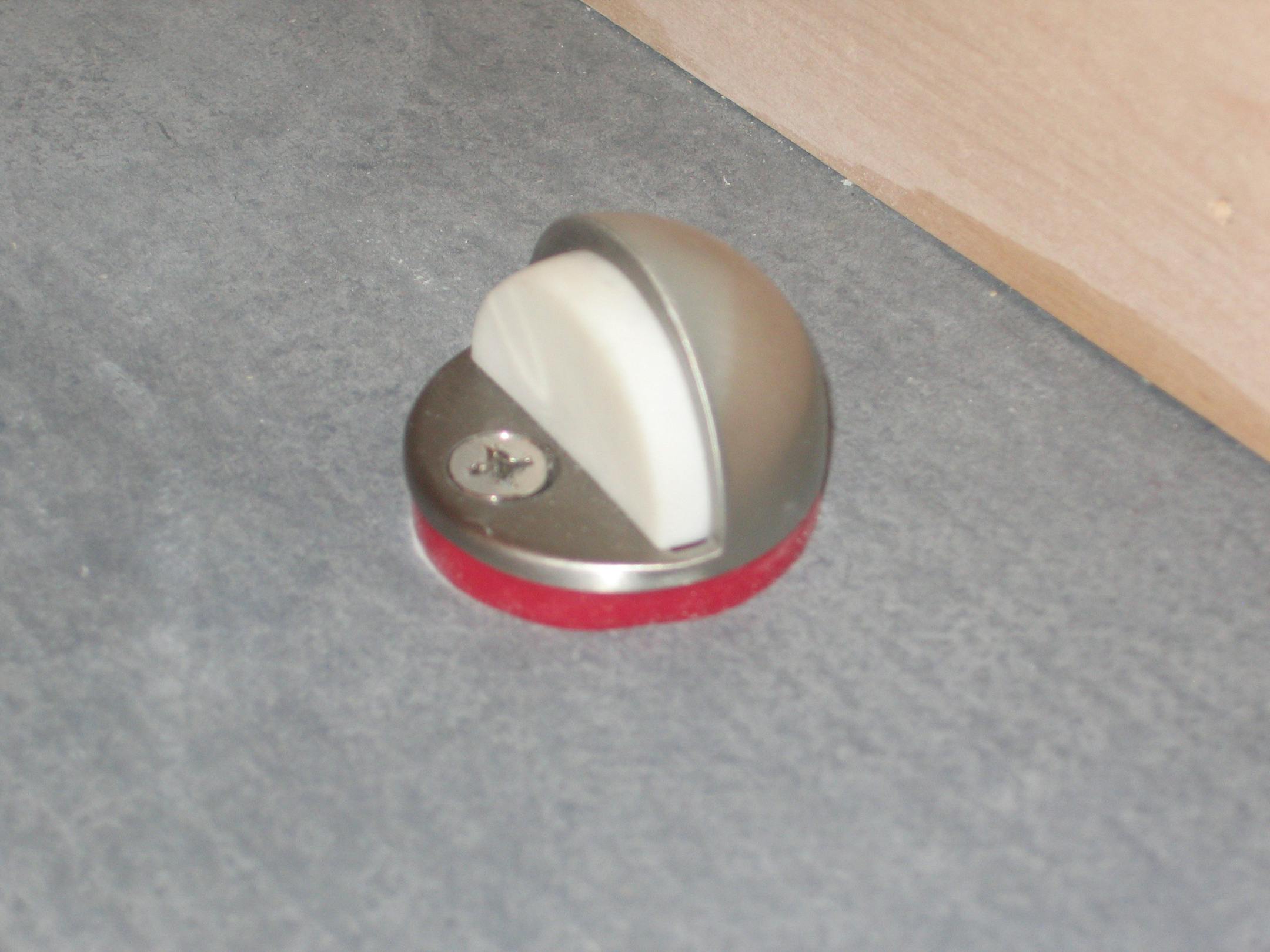 This week while installing doorstops I discovered that the one for the downstairs bathroom was about 1/8 inch short. The door hit the stop, but only the top metal area instead of the bottom rubber part. I needed something to raise the stopper about ¼ inch. As I looked for a solution, I noticed that Target's prescription containers come with a color-coded rubberized ring to tell prescriptions apart. The ring on one of our empty bottles was exactly the same size as the doorstop, so I fastened it under the stop. It was short enough that the doorstop was firmly secured but tall enough so that the door struck the rubberized pad.