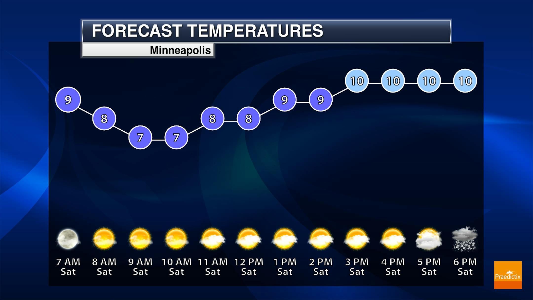 Most of the day Saturday in the Twin Cities will be quiet, but we will see increasing clouds ahead of that snow chance moving in toward the evening and overnight hours. Temperatures won't budge much throughout the day, staying in the upper single digits to low teens.