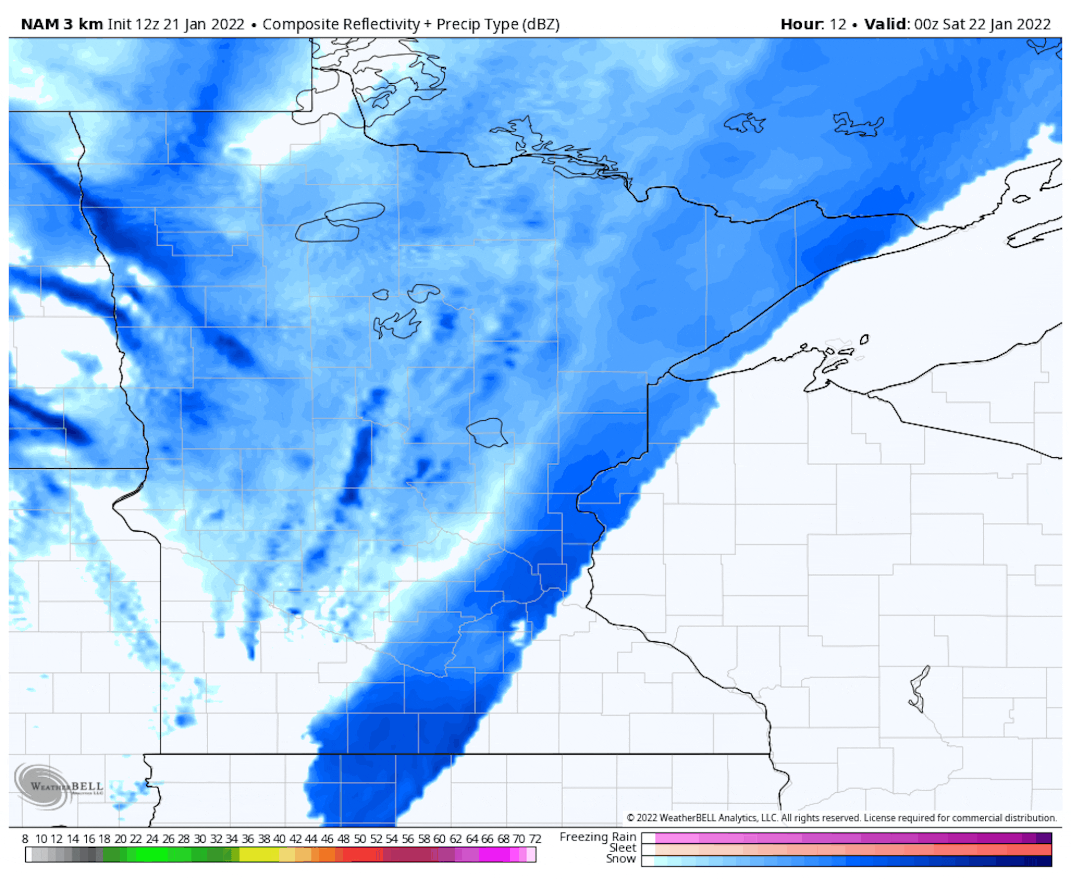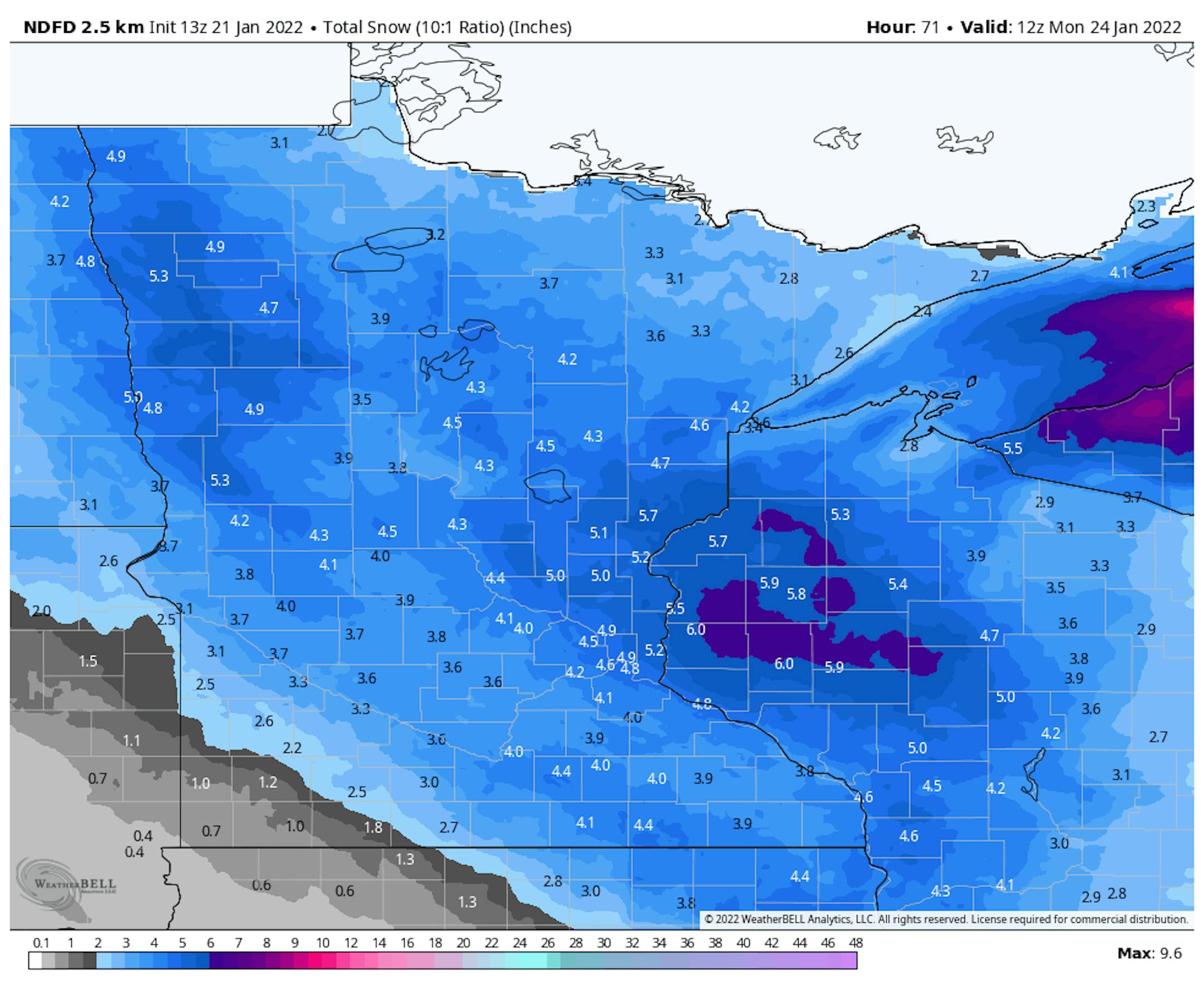 By Monday morning some of the heaviest accumulated snow will be in western Wisconsin where some 6"+ totals are possible. In the metro, we can expect 3-6" of snow throughout the weekend.