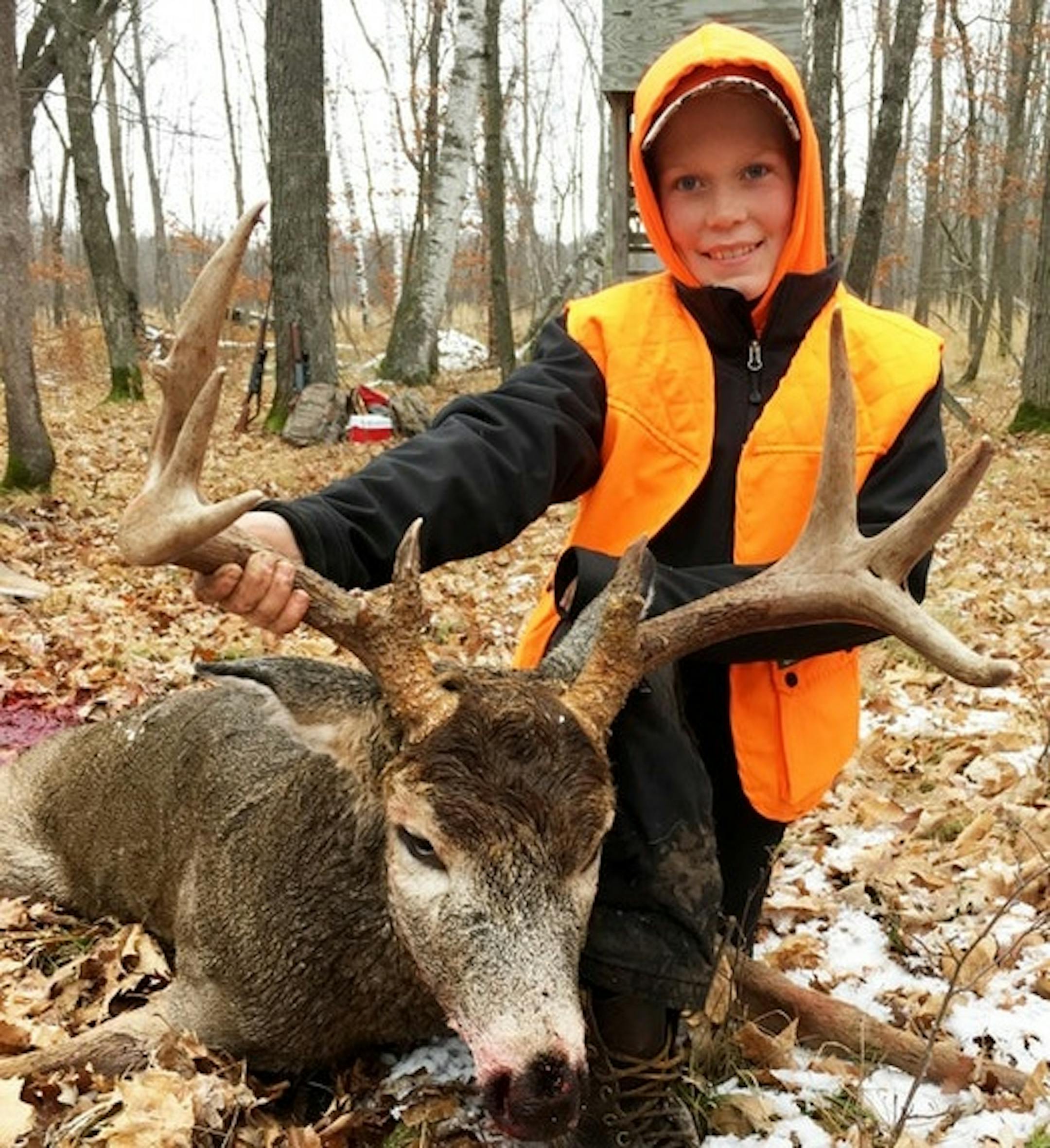 It was 7 a.m. Sunday, one day after Minnesota's traditional firearms deer season opened, when this 8-point brute with a 20-inch inside spread walked into the open below a deer stand between Parkers Prairie and Bertha. Coen Johnson, 11, of Milaca, was nudged by his mother inside the stand. "Coen!'' she whispered. "Buck!" He eased his rifle out the window and grunted to get the deer to stop. It worked. He squeezed the trigger and waited for the arrival of his grandfather, Dennis Jezierski. He found the buck less than 100 yards away.