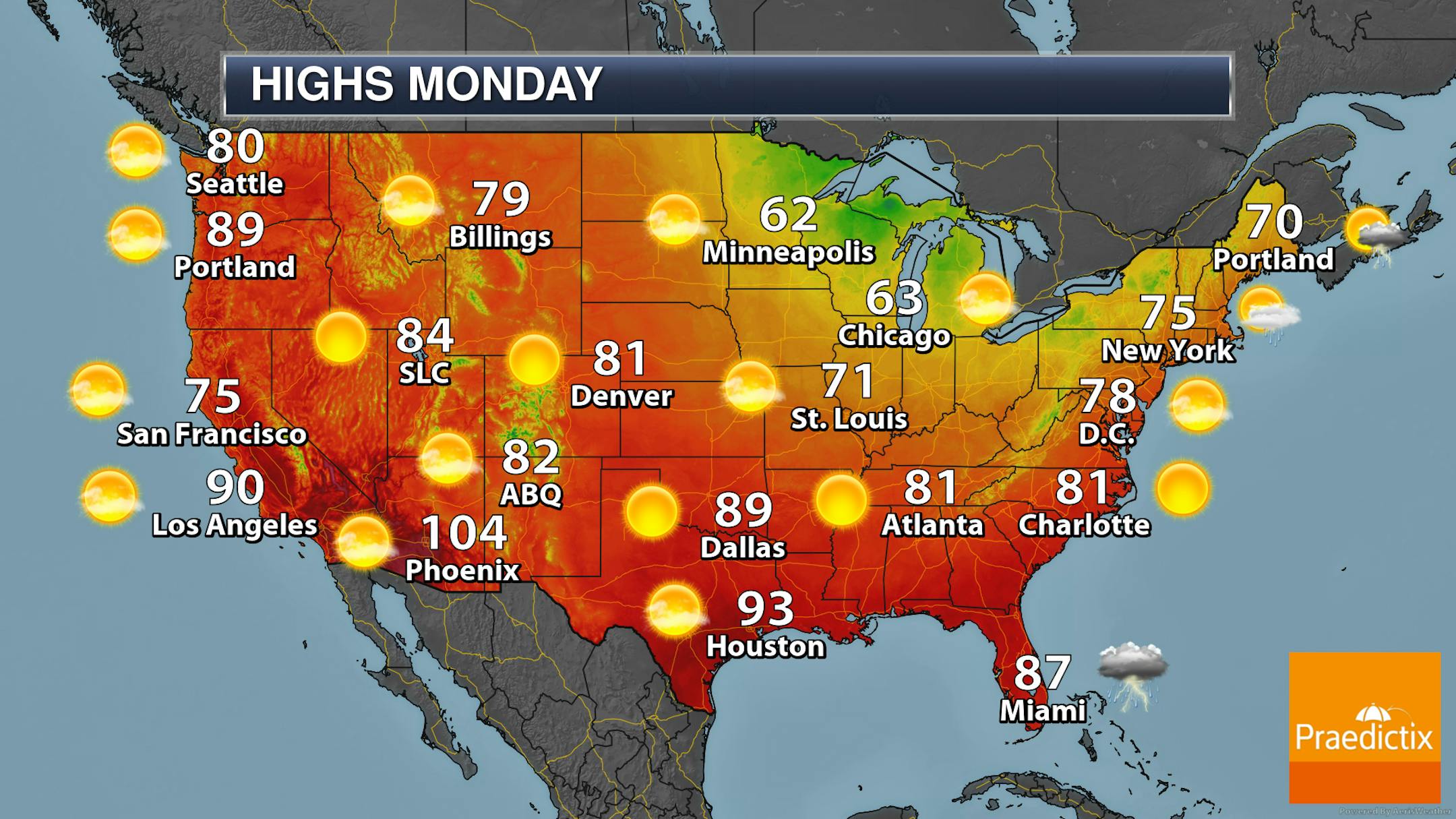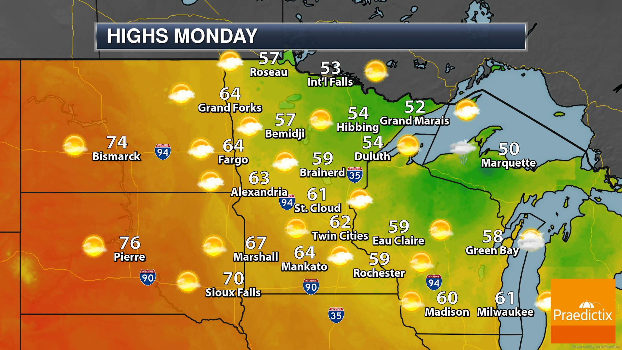 Besides those strong winds, the weather will otherwise be calm on Monday with partly to mostly sunny skies and highs in the 50s and 60s - several degrees below average.