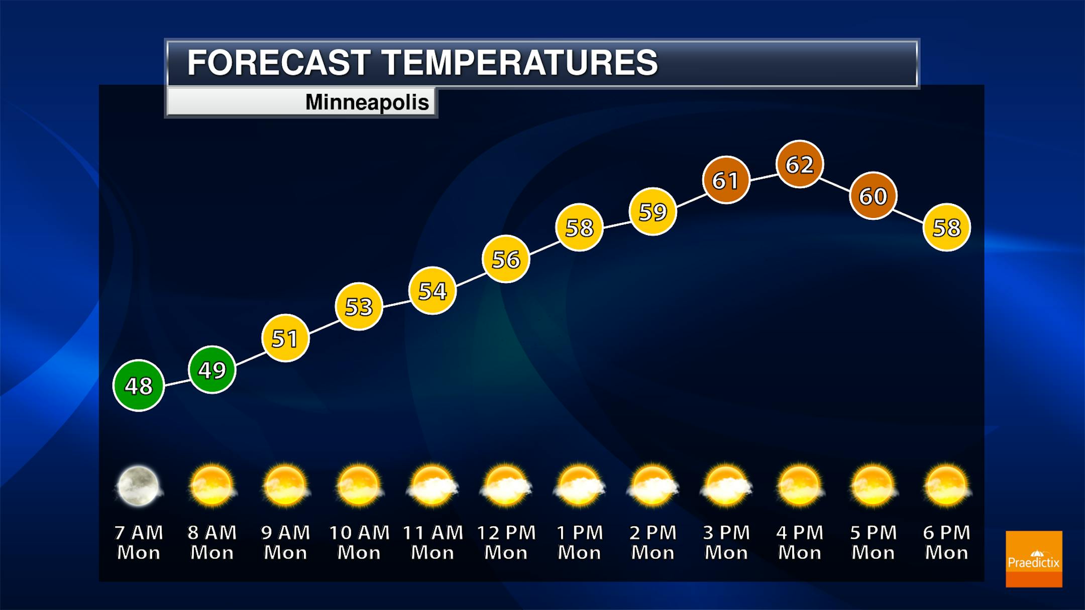 A spectacular Autumn Monday is ahead in the metro, even if the temperatures are 7F degrees below average. Mainly sunny skies with just passing clouds at times are expected. Morning temperatures start off in the upper 40s with highs climbing to the low 60s.