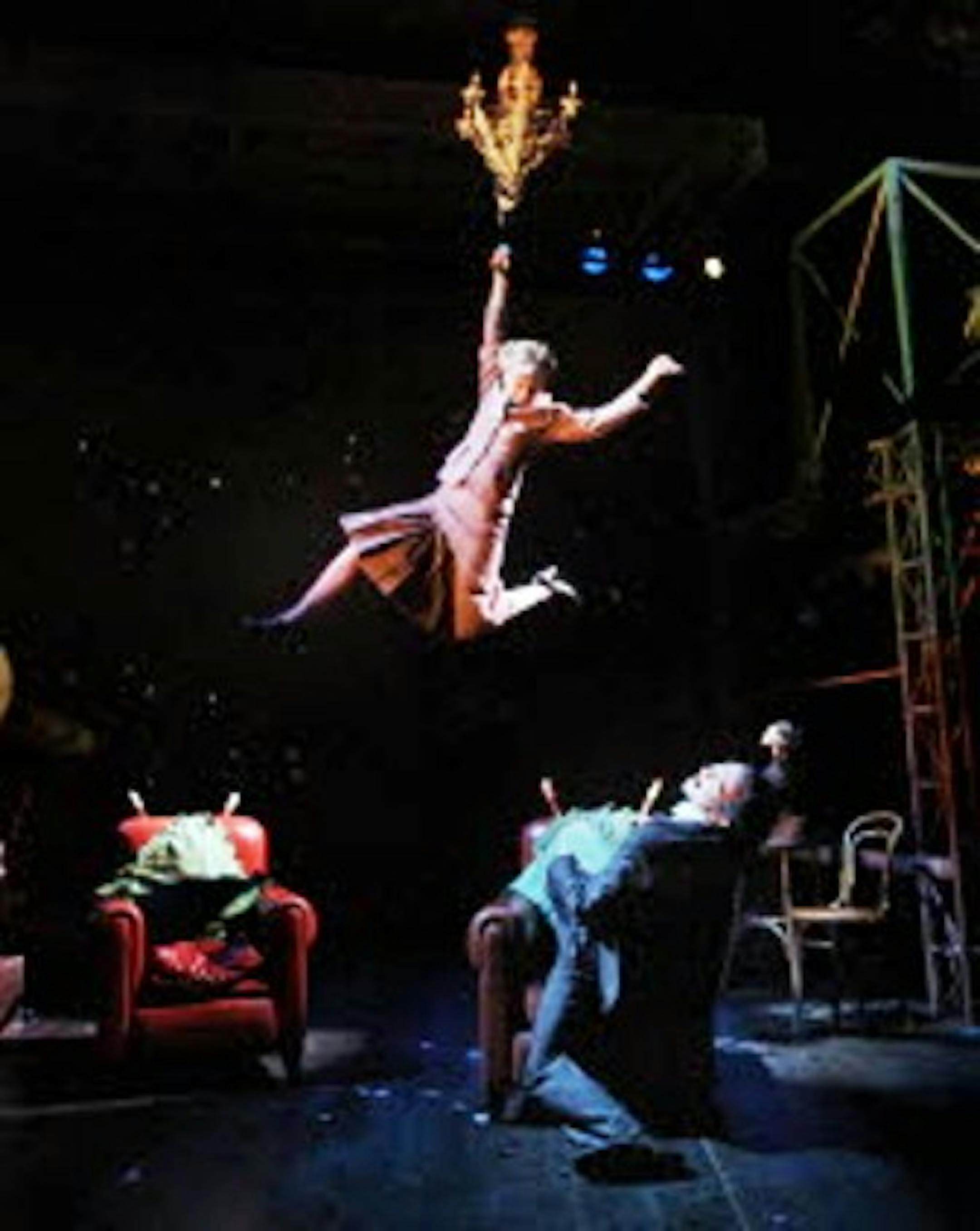 Hannah Yelland, swinging from the chandelier, as Laura and Tristan Sturrock as Alec in the play " Brief Encounter" at St. Ann's Warehouse in New York City on December 2, 2009. (Sara Krulwich/The New York Times)