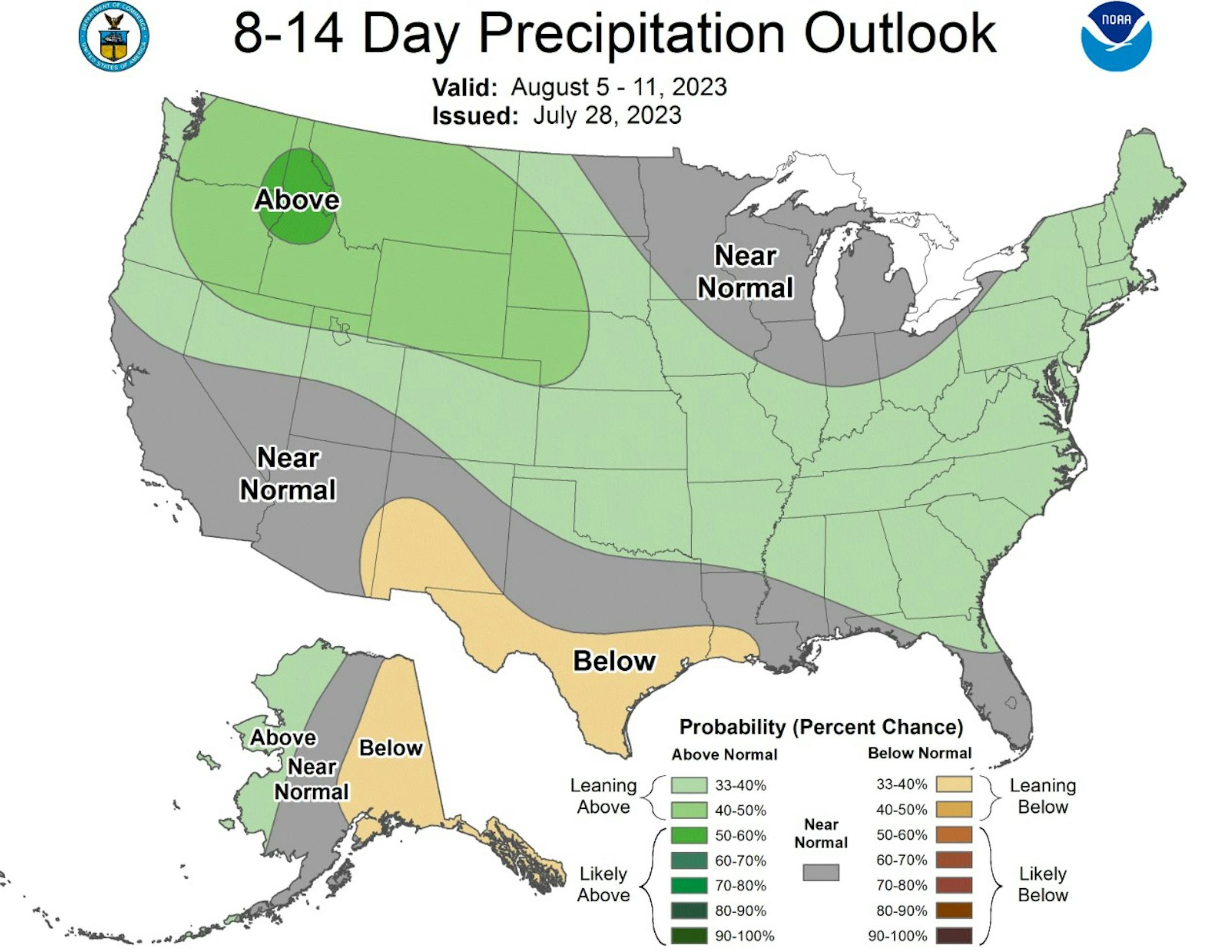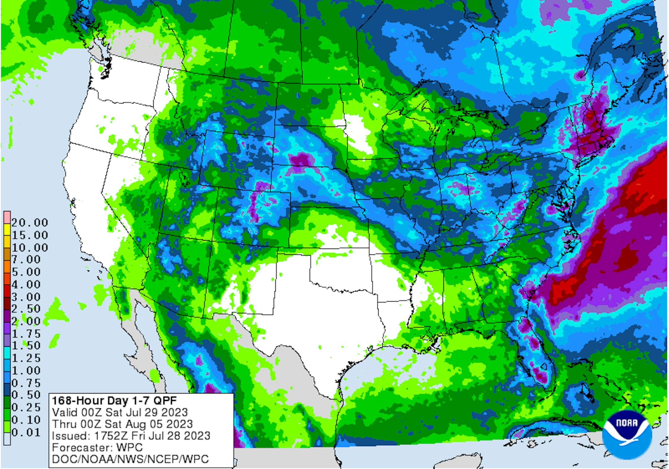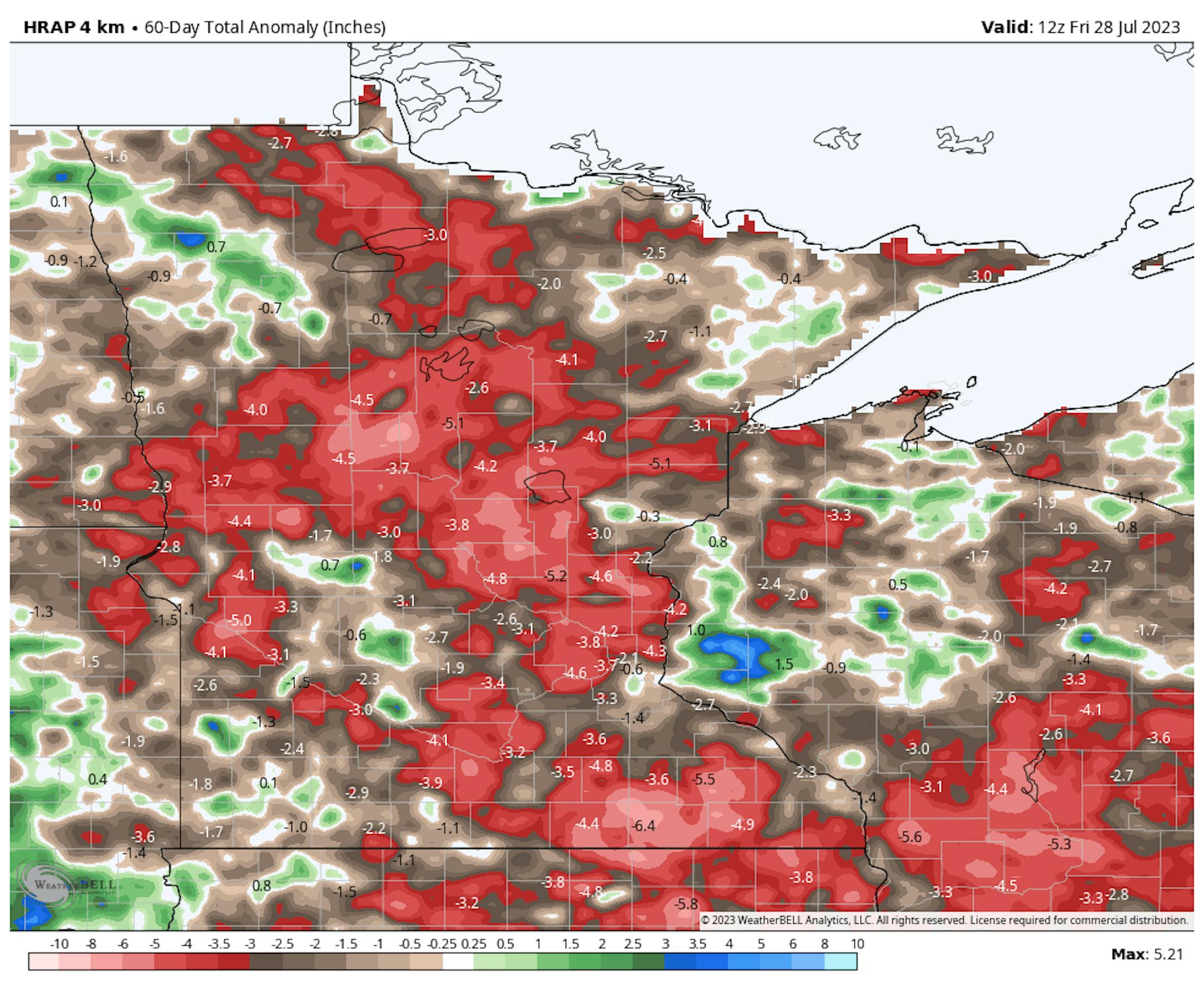 The map below shows the 60 day precipitation anomaly, which indicates that some locations are nearly -3.00" to nearly -7.00" below average (in red/pink) since mid/late May. There are a few locations across the state that have surpluses, but most locations are well below average.