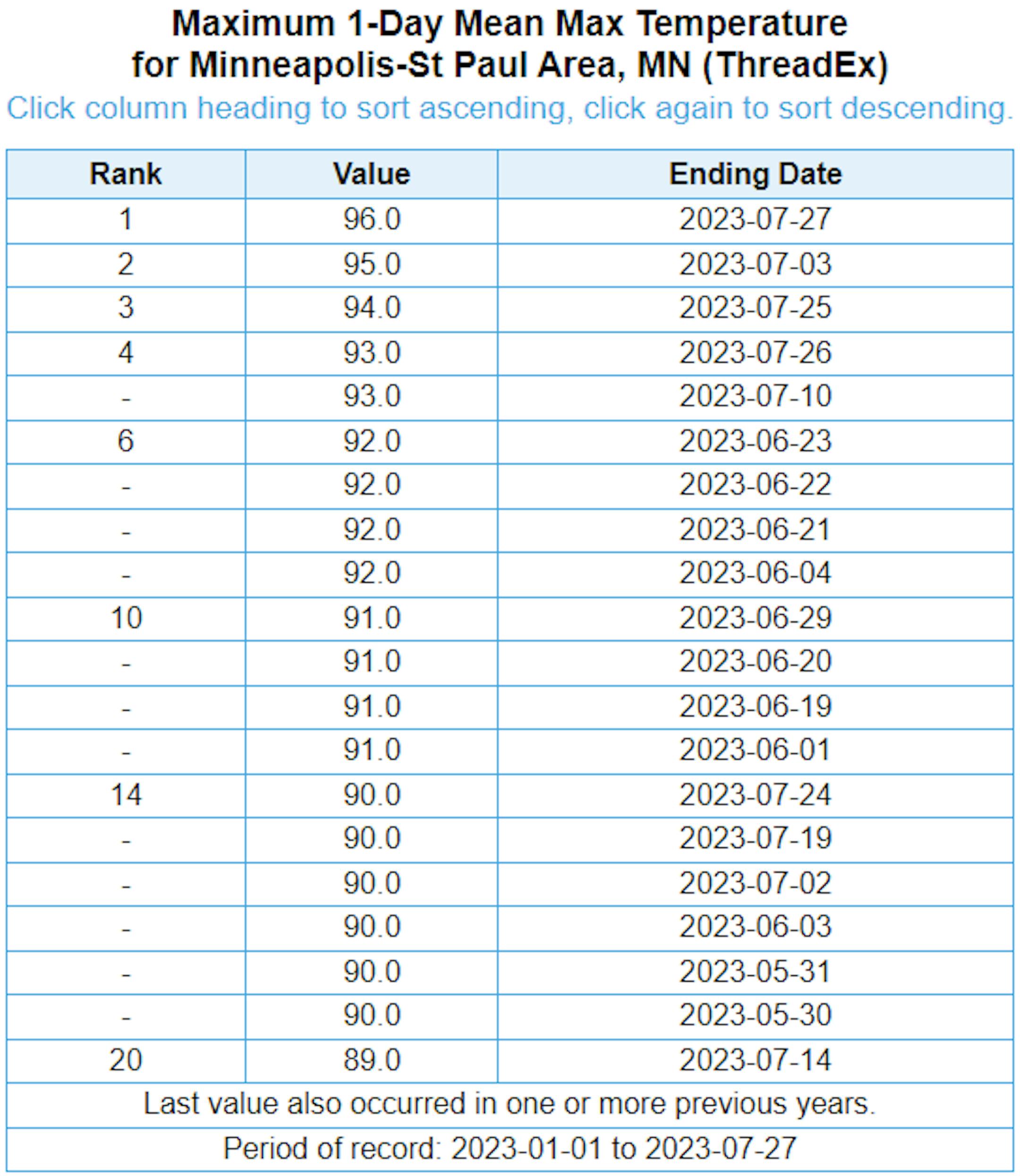 MSP Just had it's hottest week of 2023 with a number of 90F days. The hottest day of 2023 (so far) was on Thursday with a high of 96F and heat index values peaking around 105F to 110F. Uffda! Here are the 20 hottest days of 2023 so far. Note that we made it into the 90s again Friday, so that makes (20) 90F days this year. Our average number of 90F days is 14.