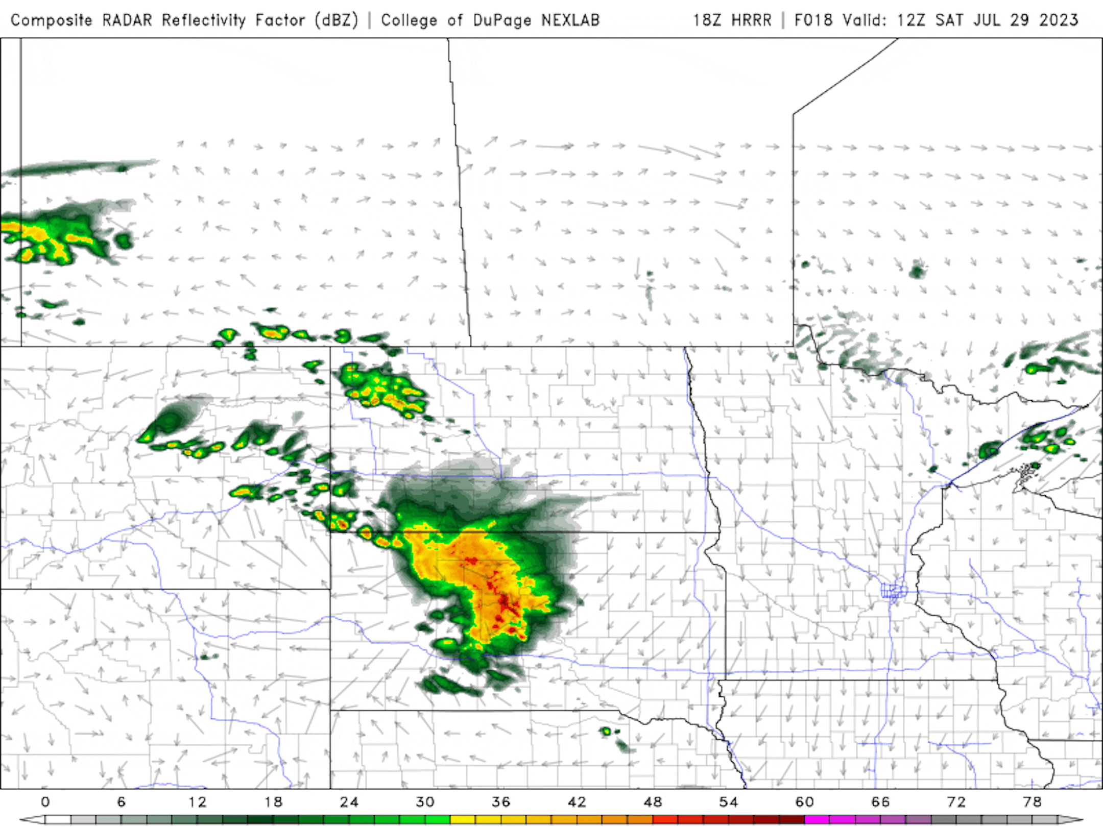 The simulated radar from AM Saturday to midday Sunday shows generally dry conditions for the first half of the weekend. However, late Sunday could feature a few showers and/or perhaps a rumble of thunder if they can hold together during the day Sunday.
