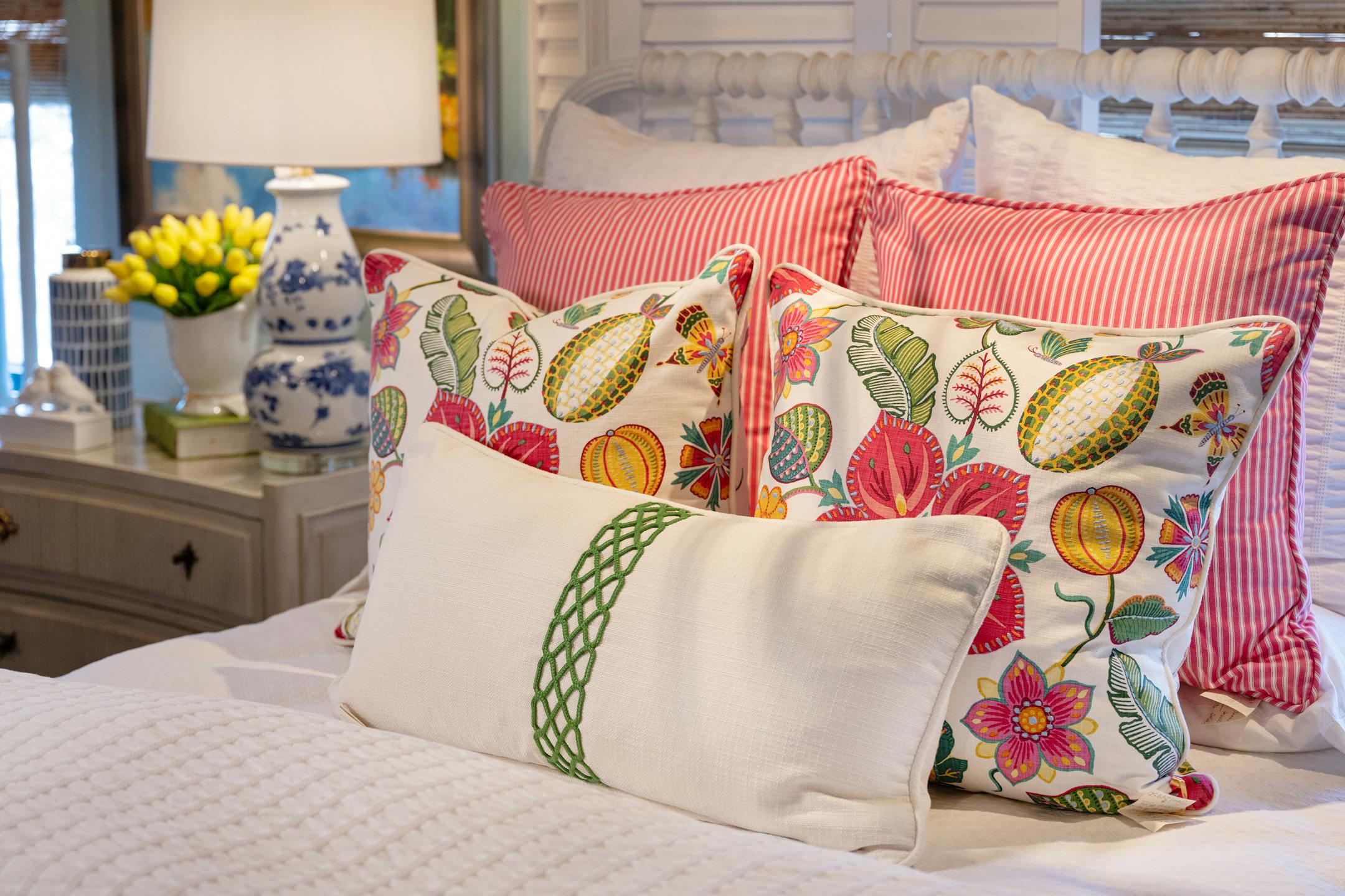 A little pink or red in the bedroom can easily be achieved by a mix of pillows and, if you’re a fan of these hues, additional bedding like duvets, coverlets and quilts. These colors inject a bit of passion and warmth, whether you opt for subtle patterns or bold designs. Layering different textures and shades can also add depth and interest to your bedding ensemble.