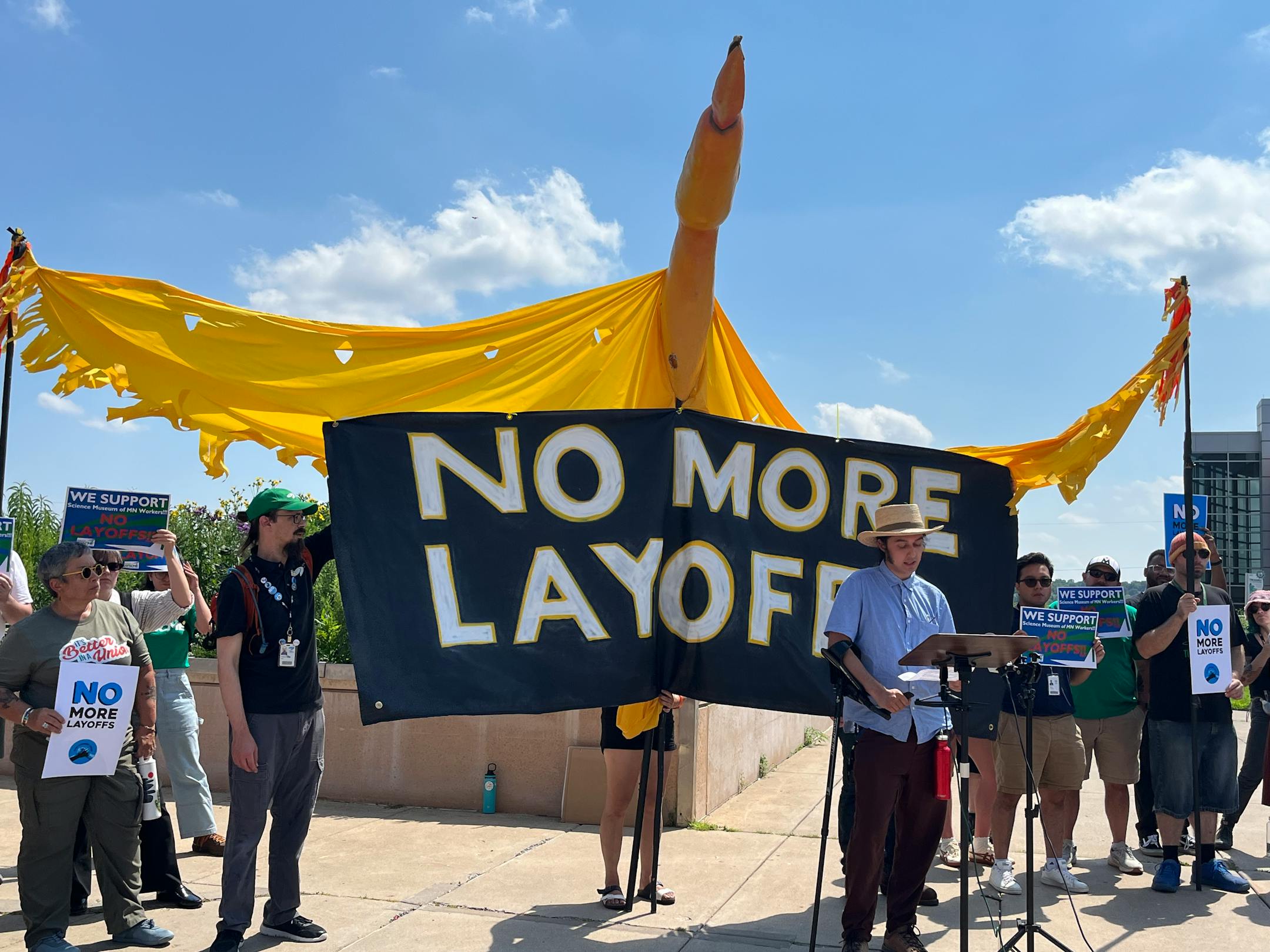 Museum staff rallied with members of AFSCME Council 5 under a great yellow puppet — of a bird? Pterodactyl? — and a banner reading “no more layoffs.” People who devote their lives to museum work know how to catch the public’s eye.