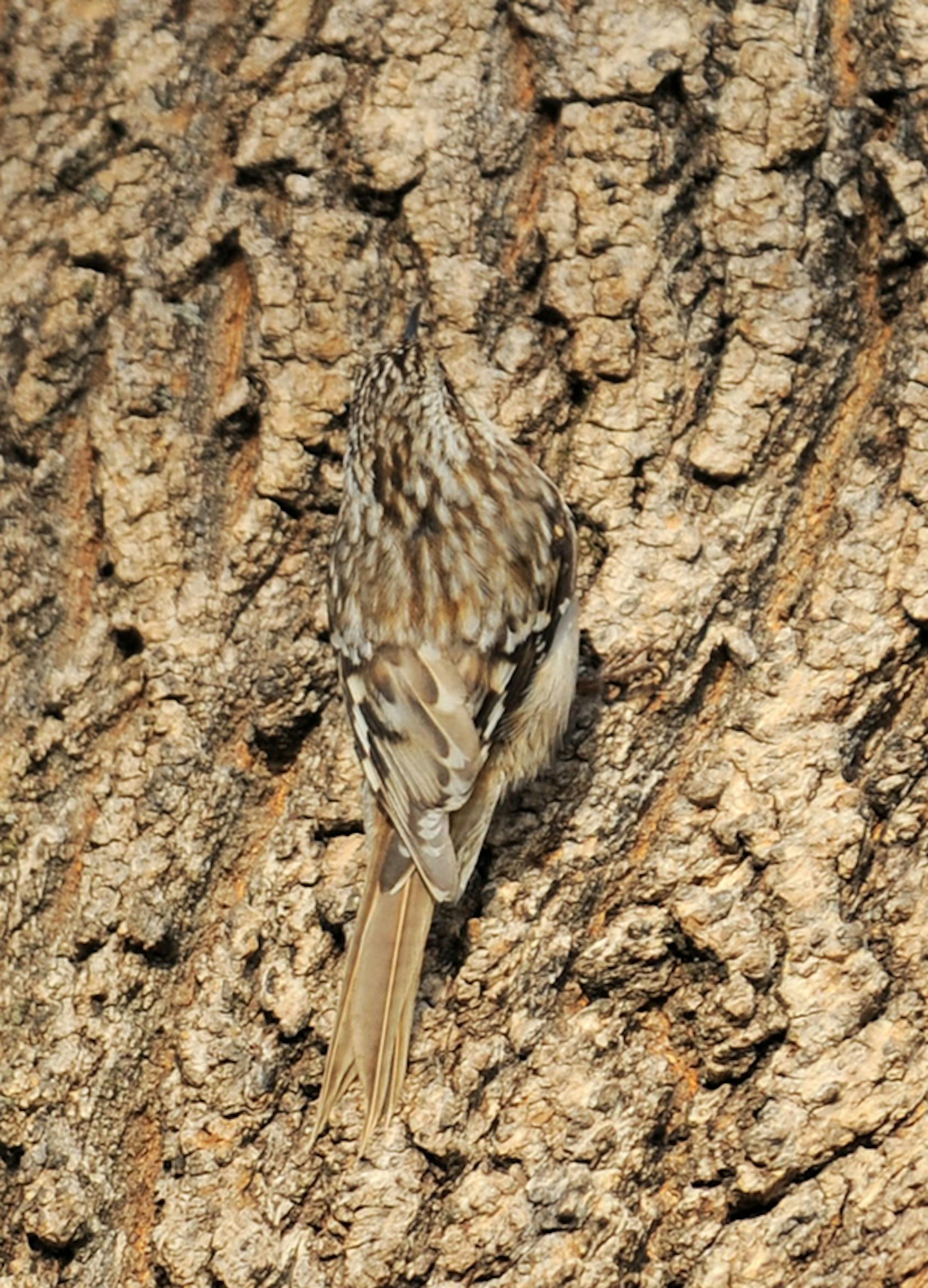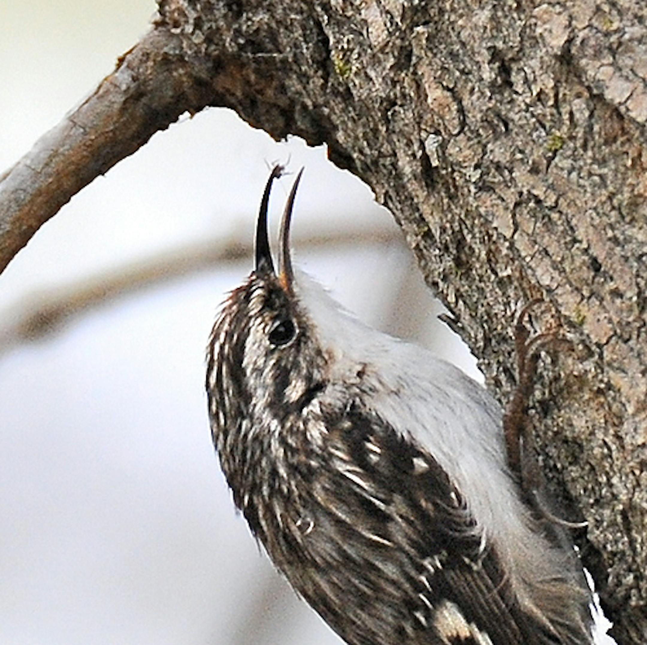 Brown Creepers use a non-stop foraging technique as they hunt for food in the cracks and crevices of tree trunks and branches. They appear to never pause long enough to actually capture the insects they seek. In the photo, a Brown Creeper has just pulled a tiny spider from behind a piece of bark. Given the size of the prey, it's no wonder they work ceasely and quickly to find food. It takes many spiders to fuel a creeper day, particularly in the winter. This photo was taken on a cold, blustery day in late April. The second photo, taken elsewhere, illustrates the camoflauge the bird has developed to give it safety as it works in a relatively open fashion.