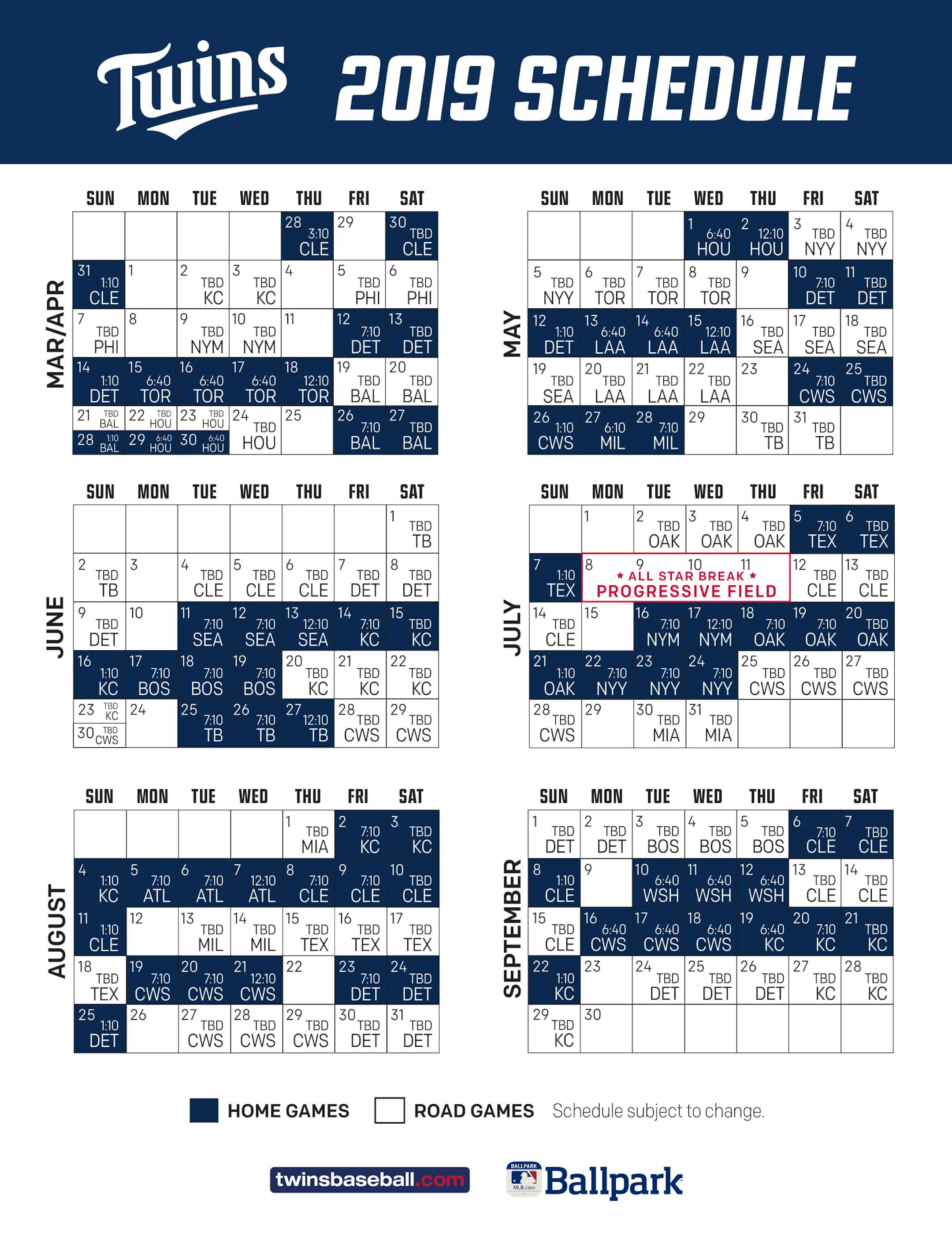 Major League Baseball released the 2019 schedule Wednesday, and it includes some history for the Twins. On March 28, 30 and 31, the Twins and Cleveland Indians will play — they hope — the first games over held outdoors in Minnesota in March.