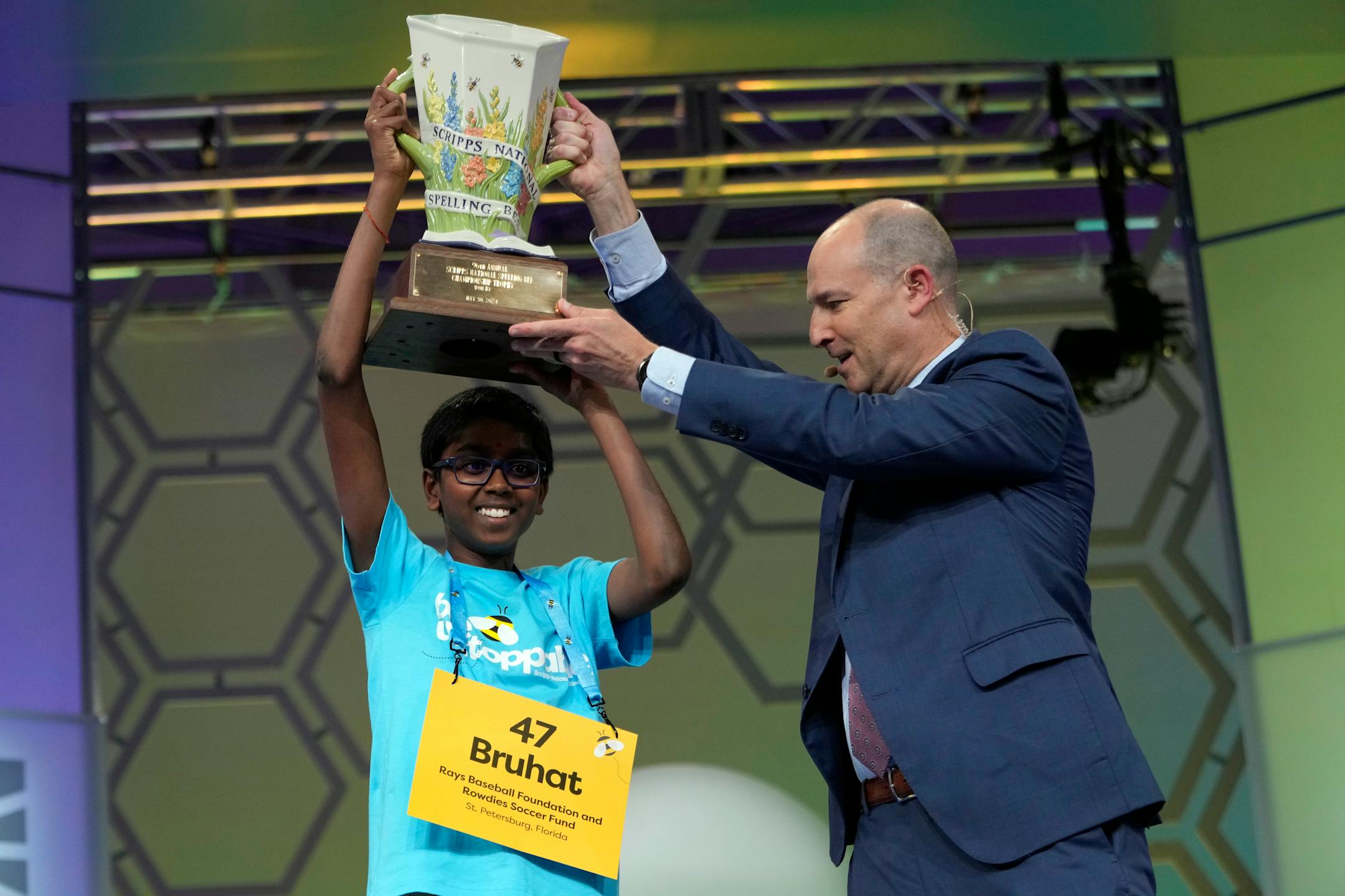 The 12-year-old seventh-grader from Tampa, Florida, blitzed through 30 words in 90 seconds Thursday night, sounding more like an auctioneer than the best speller in the English language, and judges determined that he spelled 29 of them correctly — nine more than his competitor, Faizan Zaki. As the champion, Bruhat receives a trophy and more than $50,000 in cash and prizes.