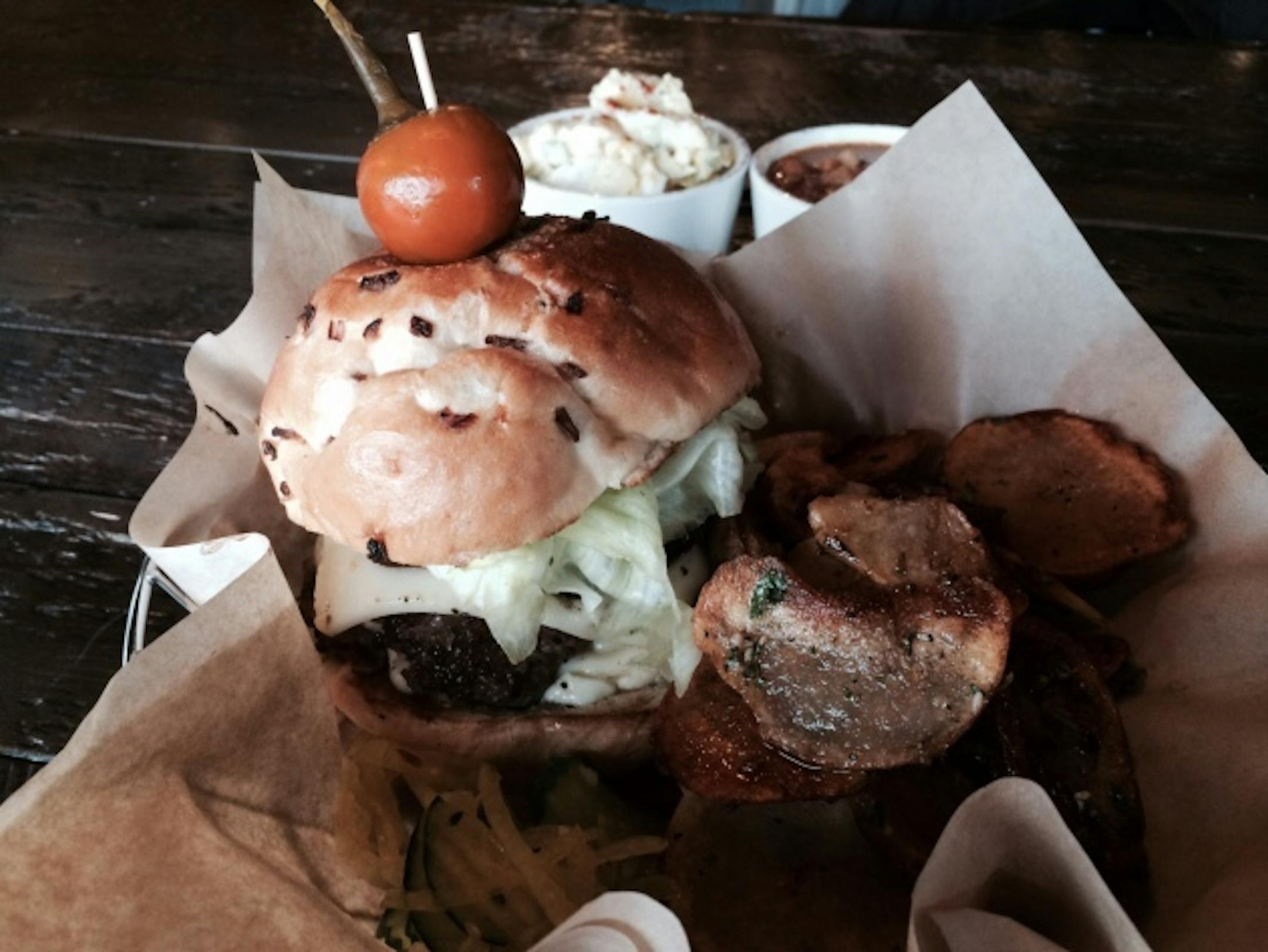 More onions come in the form of a garnish, a cap of thick-cut red onions that Bush rubs in olive oil and dresses with his fried chicken's spice blend, grilling them until they take on a smoky goodness. The final touch, onion-wise, is channeled via a sturdy, lightly toasted onion bun, baked at Breadsmith. Add crunchy iceberg lettuce and a few generous dollops of housemade mayonnaise, and you've got yourself one terrific burger.