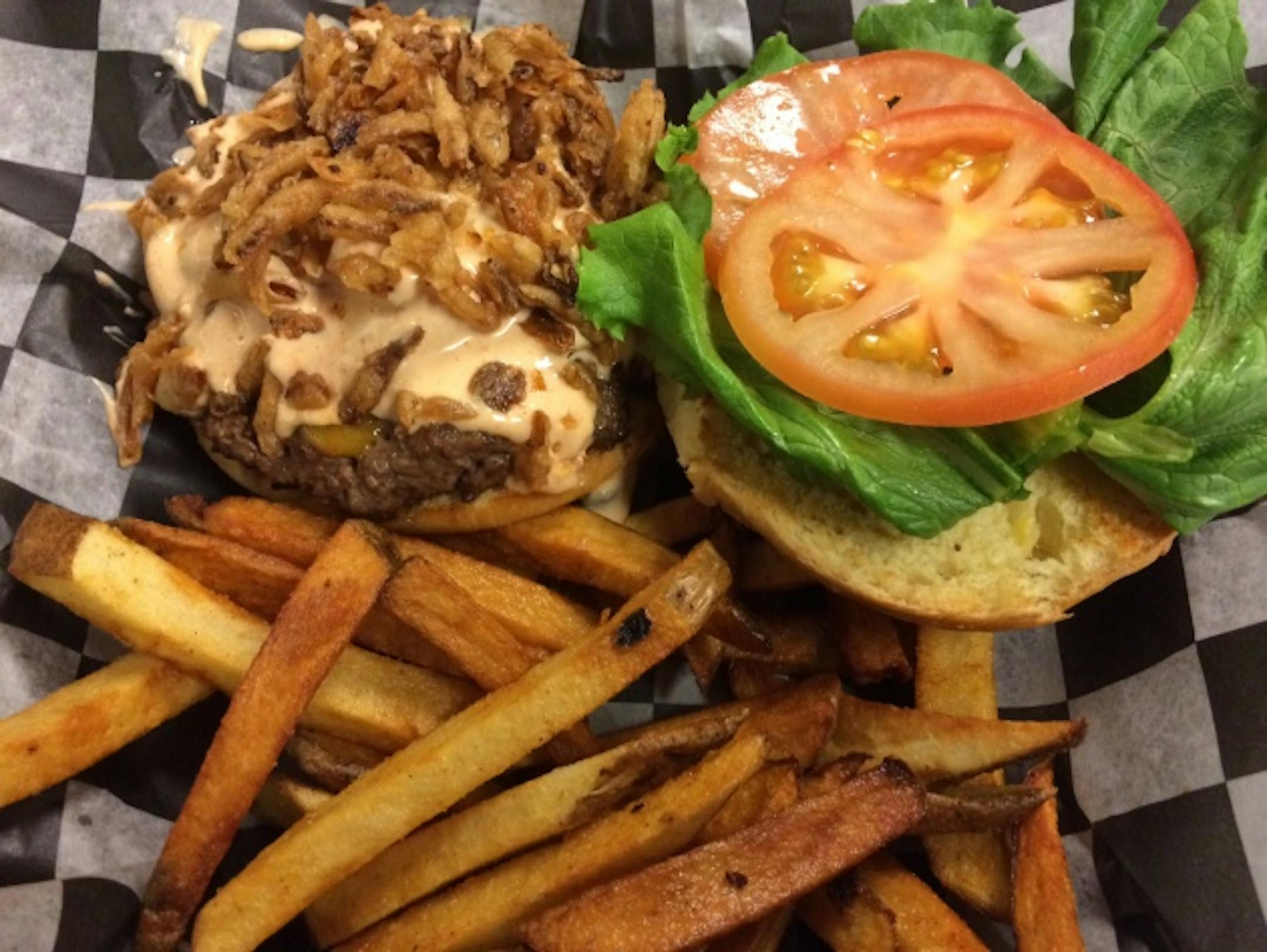 The combination is basically a heart attack waiting to happen, and utterly irresistible to a junk-food fanatic like yours truly. Nothing is skimped upon, either: sautéed mushrooms, thick-cut (and teasingly smoky) bacon and a crispy flurry of battered and fried onions, a blanket of Cheddar cheese, they all get the pile-on treatment. What's not to love, right? (True confessions: While I was eating it, with a knife and fork because it was beyond sloppy, I made myself stop at the halfway point, as I could hear the voice of every doctor on every TV show saying, everything, in moderation).