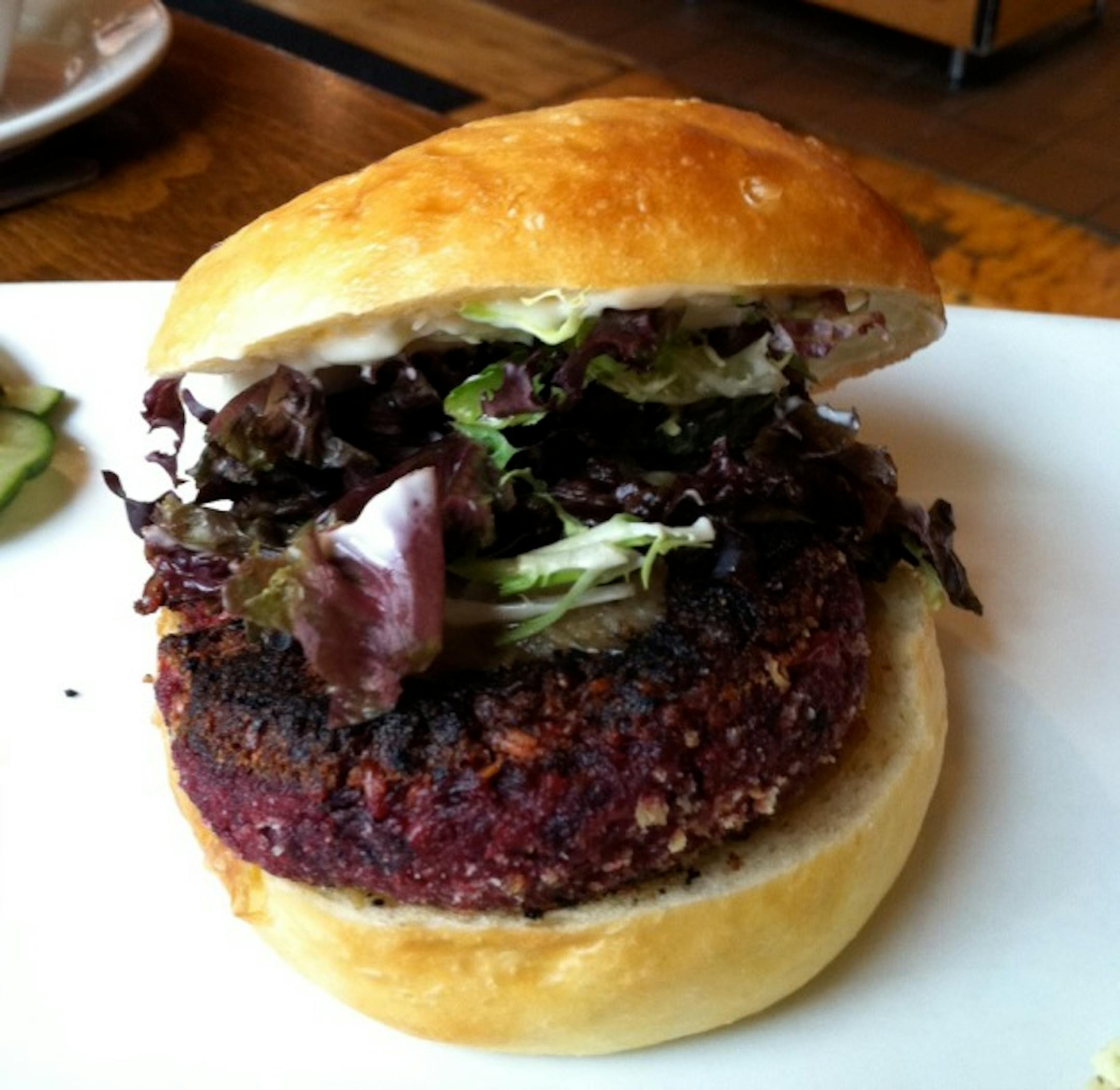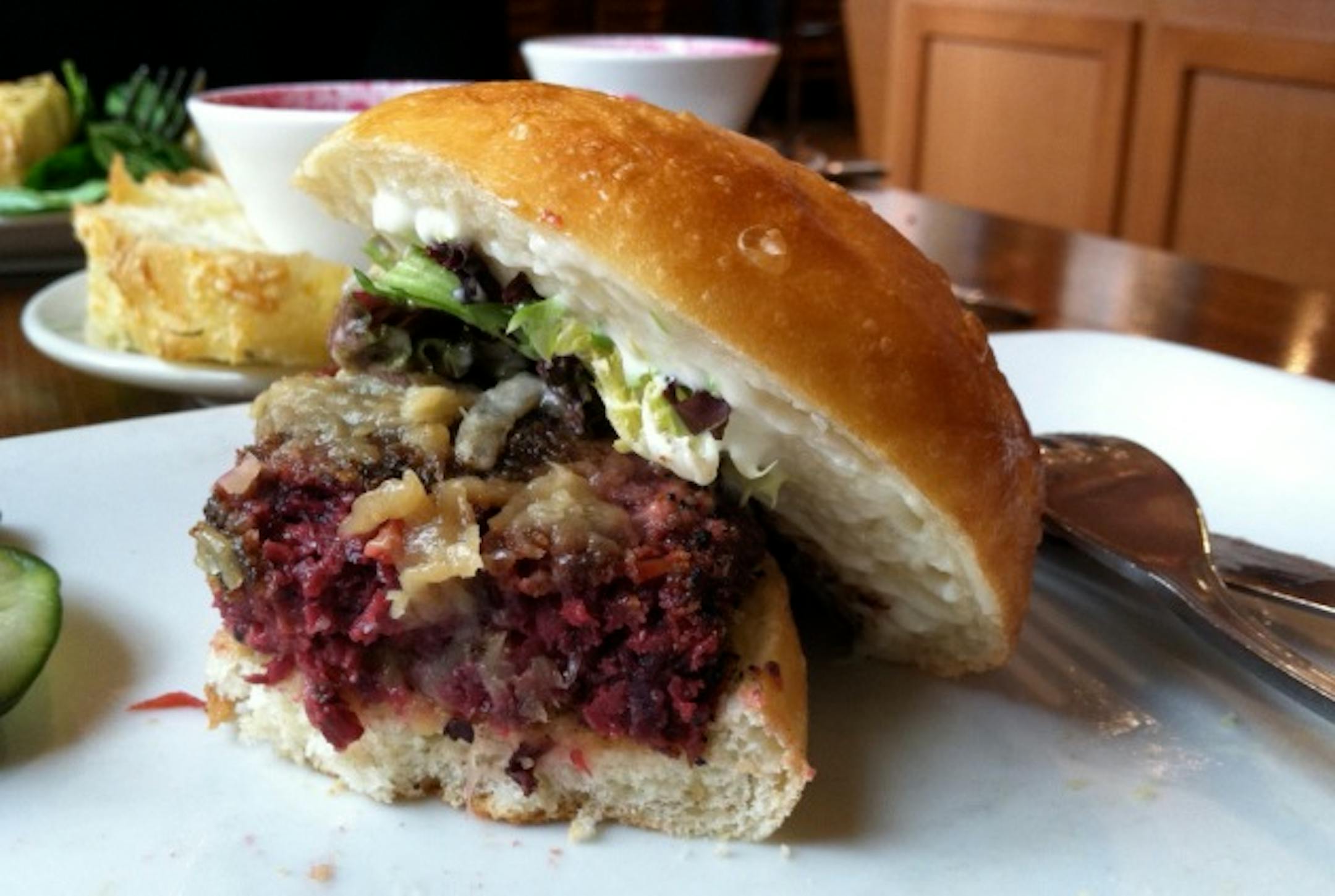 There's plenty of texture in this patty. Sensitive to diners with nut allergies, Ryan and Bickford forgo cashews, walnuts and other veggie burger staples in favor of raw carrots. For protein, there's quinoa and quick-cooked oats. The most noticeable ingredient is roasted and grated red beets, which give the patty its sort-of beefy color and imbues each bite with a hint of earthy sweetness.