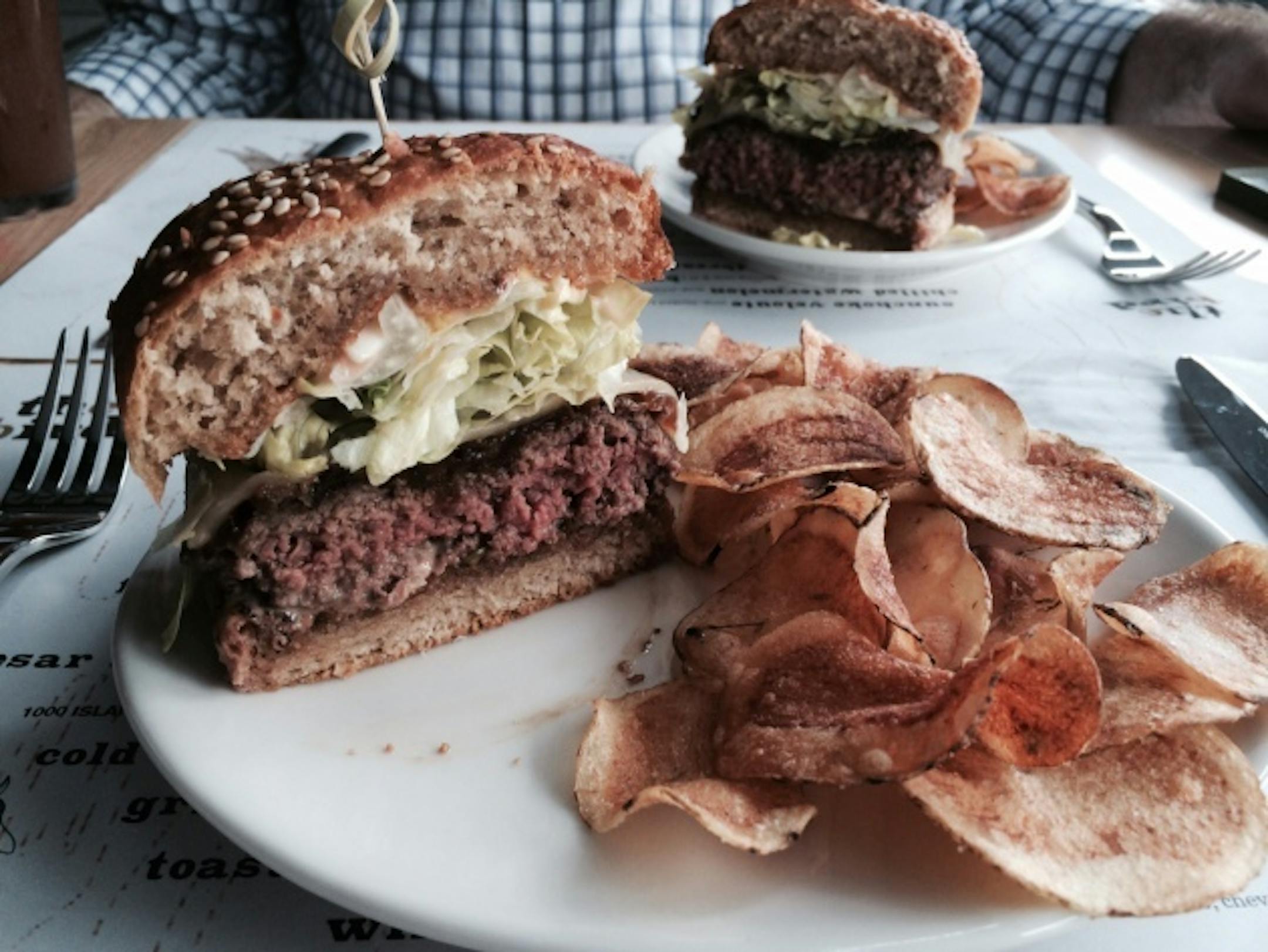 Mission accomplished. Almendinger wisely exercises restraint, allowing the meat's gentle, pristine flavor to speak for itself. The only (well-calibrated) seasoning is salt and pepper, and then the thick, hand-formed patties are fried on a flattop. In butter, a welcome fat injection for the naturally lean meat.