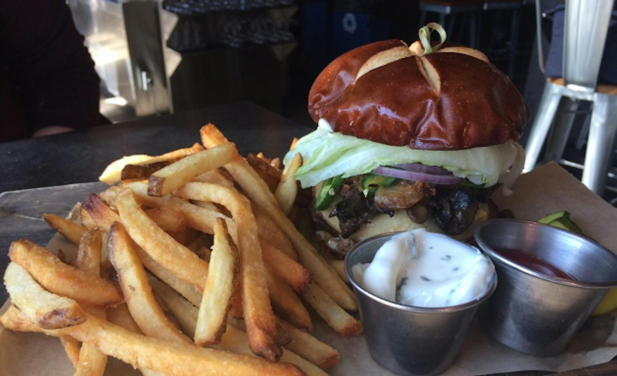 It's a labor-intensive process. Each meat gets its own grind. They're fused in a second grind, then formed into a thick 8-oz. patty, their centers filled with 1 1/2 ounces of smoked Gouda ("It's dense, so it won't melt the way a traditional Cheddar or American would," said Luna), bacon jam (more on that little touch of heaven in a moment) and fresh jalapenos.