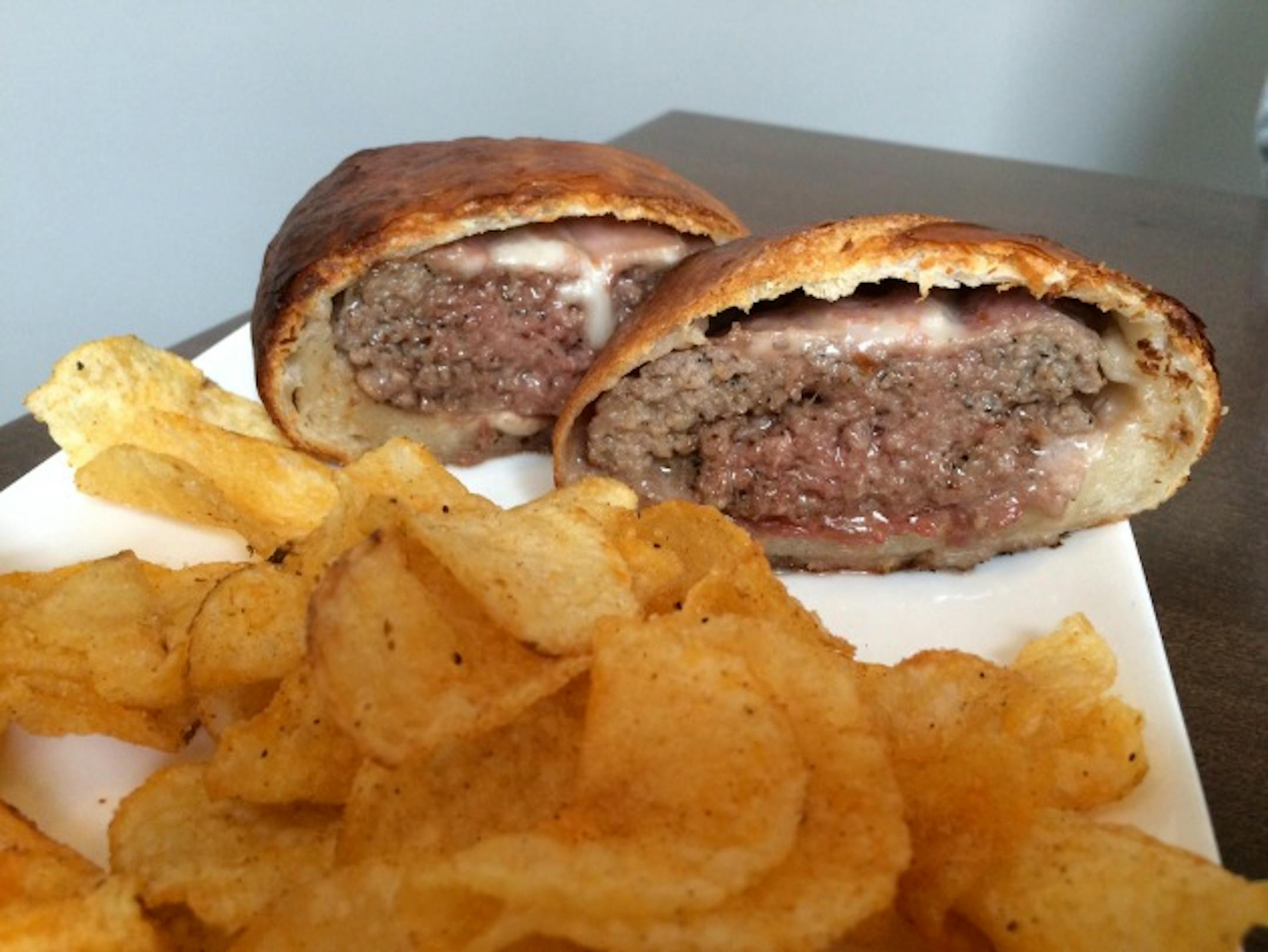 It starts with a 80/20 blend (that's 80 percent lean ground beef and 20 percent beef fat) that Willenbring liberally seasons with garlic, brown sugar and salt and pepper, then forms into noticeably thick patties. Each patty gets wrapped in three layers: provolone, prosciutto and a commercially prepared puff pastry. Then it goes into the oven.