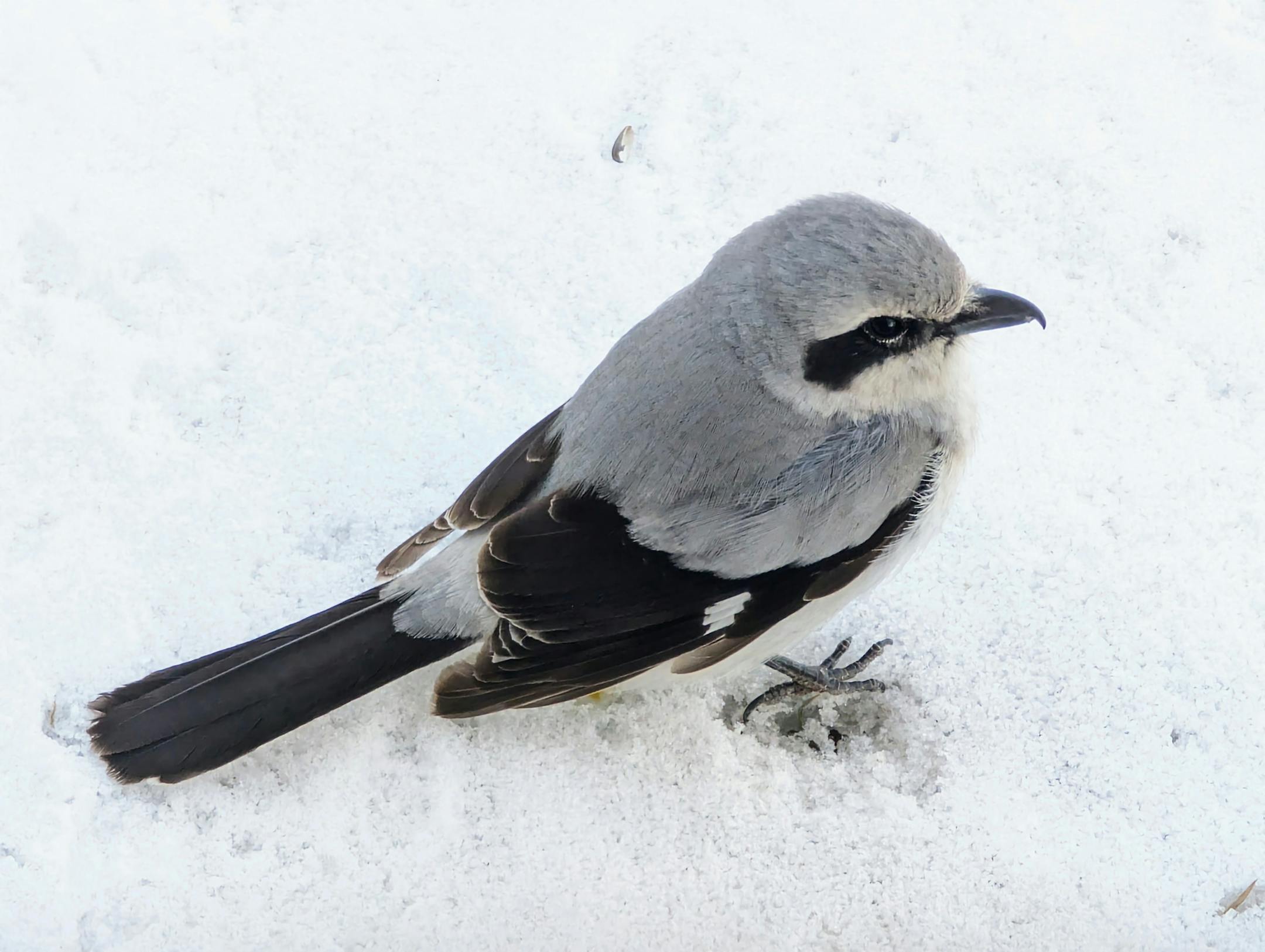 Q. I heard a bird hit our picture window, which is a rare occurrence, since our feeders are close to the house. Looking out, I saw a grayish bird about blue jay size — it had a black stripe through its eye — sitting in the planter boxes below. It picked up a small, lifeless bird and flew off. My field guide says this was a northern shrike and that they feed on small birds. Is it likely to hang around and prey on the other feeder birds? Does it remain in our area all winter?