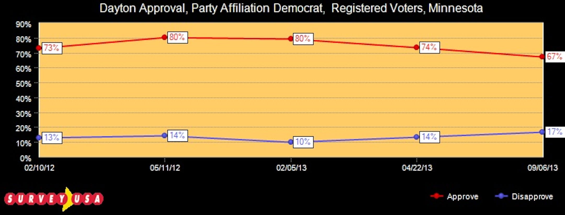 According to the SurveyUSA poll, Dayton went from an 80 percent approval rating among self-identified Democrats in May of last year and February of this year to 67 percent approval rating. The pollster said that segment of the poll had a plus or minus 6.7 percentage point margin of sampling error.