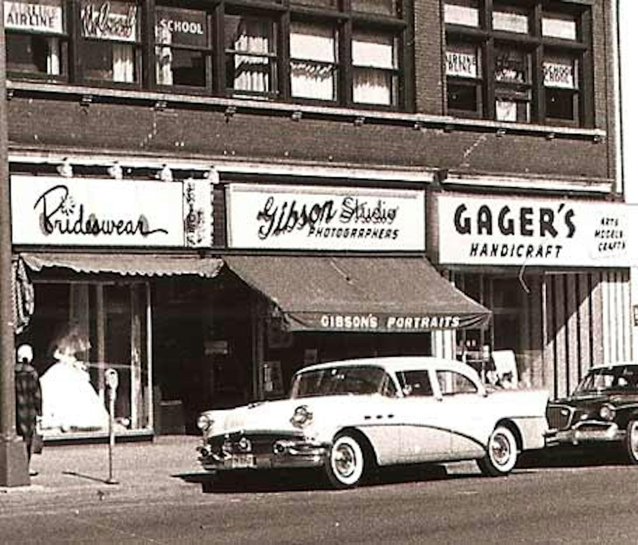 The upper floors have signs for an "Airline School" - could be a stewardess school, perhaps? Gager's was a craft store with a few outlets, if I recall correctly.