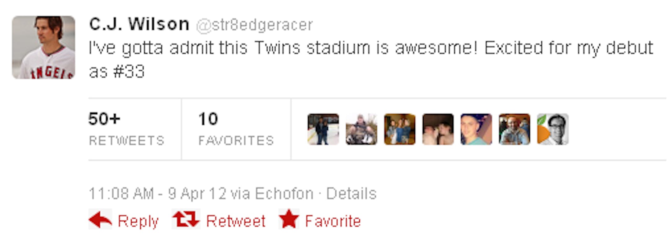 Maybe C.J. Wilson is just admiring Target Field all over again. But after he tweeted that a while ago (and we re-tweeted it), Amanda Rykoff sharply noted that this isn't exactly C.J.'s Target Field debut.