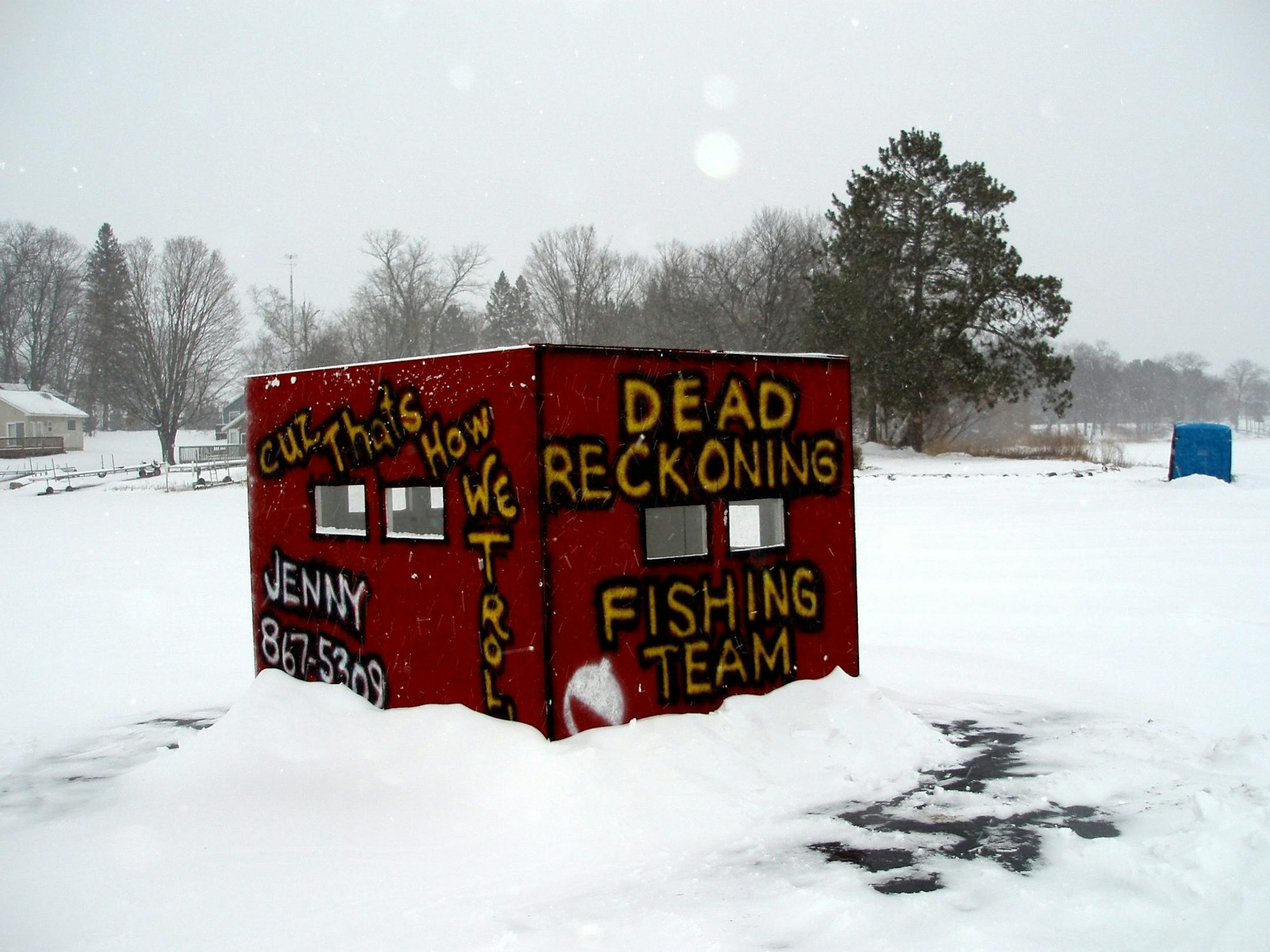 Our shack also needed to be identified. Most people use their license numbers. We thought an easier way was to just spray some paint on it. Once we did that, we felt maybe it should be embellished a bit more. The contrasting colors of our paint job stood out like a sore thumb on Lone Lake and attracted many a snowmobiler and ice fisherman.
