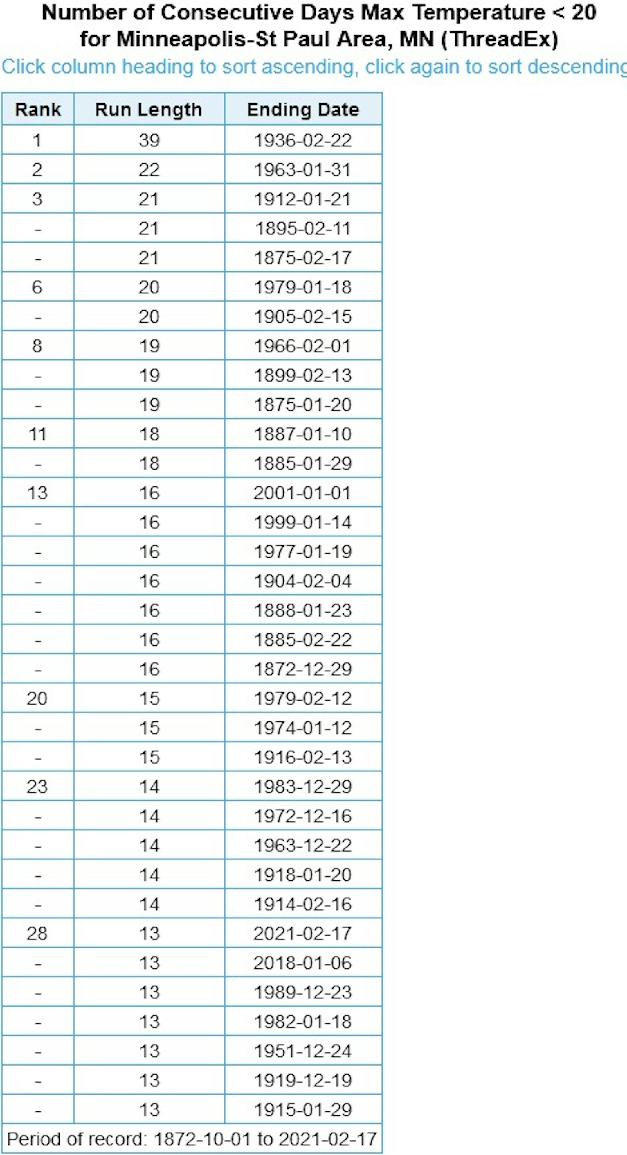 As warmer weather continues to arrive the next few days, we are slowly starting to end our streaks of consecutive days with temperatures colder than a certain temperature. One that is still alive and running is our streak of highs that are colder than +20F. Through Wednesday, we were at 13 straight days, good enough for a tie for 28th place. We should add two more days to that (Thursday and Friday), which would bring us up to 15 straight days and a tie for the 20th longest stretch on record.