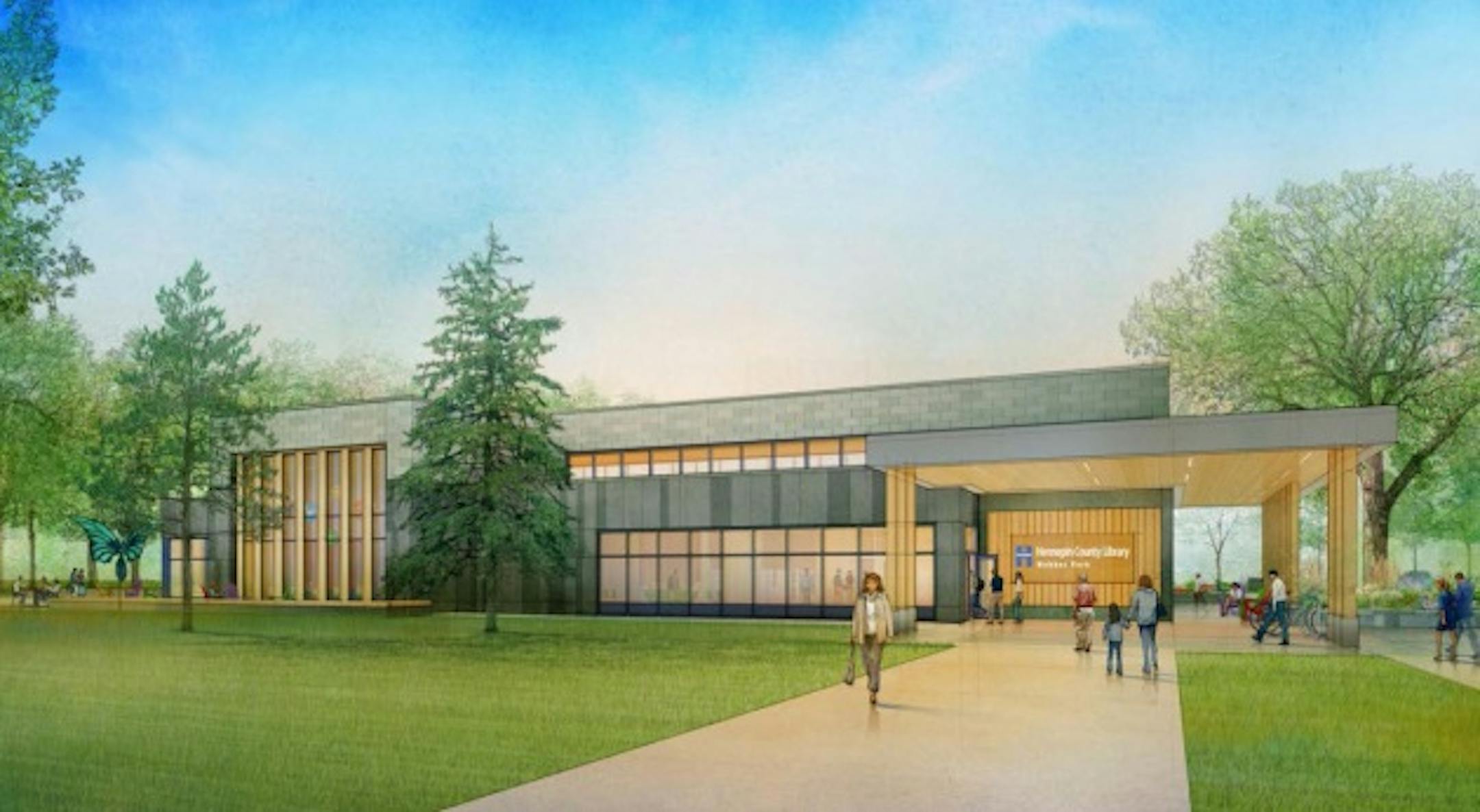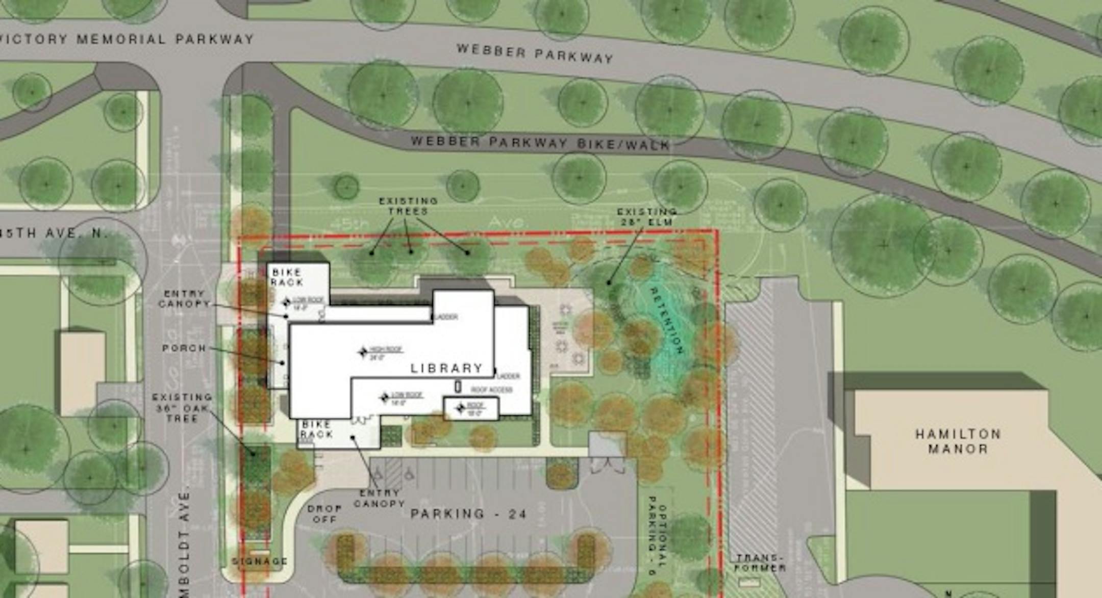 The proposal also creates outdoor spaces, including an outdoor reading area east of the building where a shallow storm water retention pond is planned. There will be one plaza at the building's northwest entrance off parkway bike-walk paths, and another at the south entrance from a 24-car parking lot. A porch with seating will from the Humboldt side.