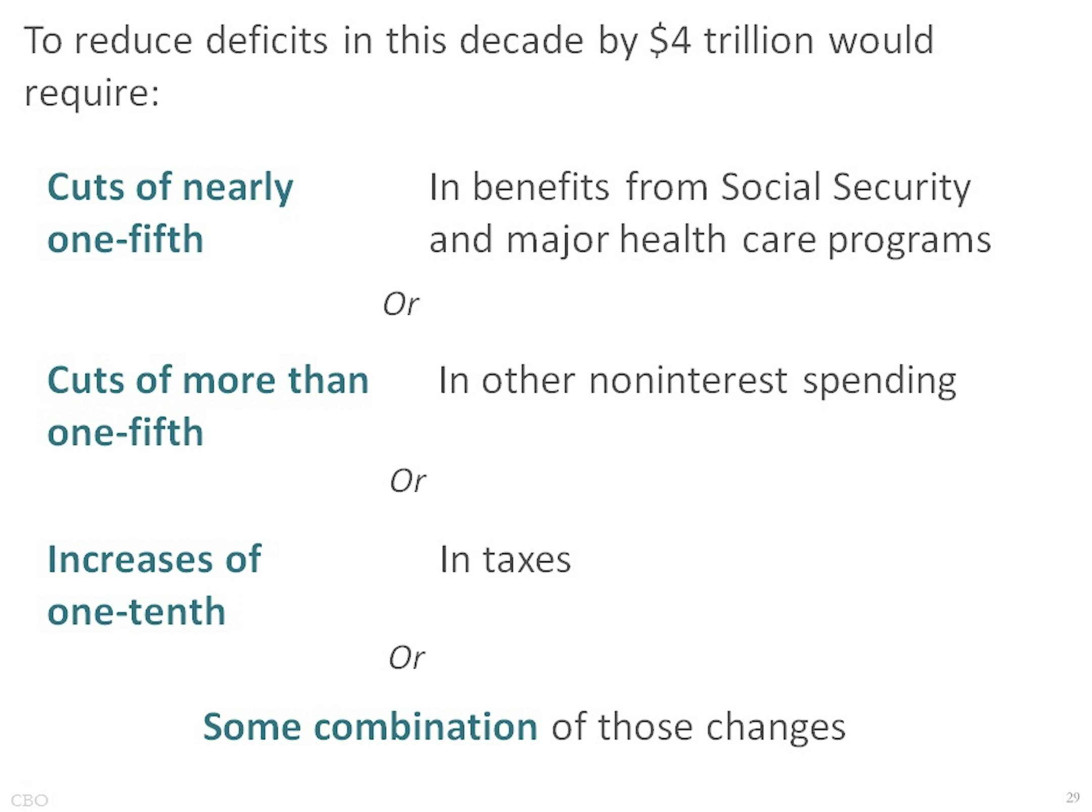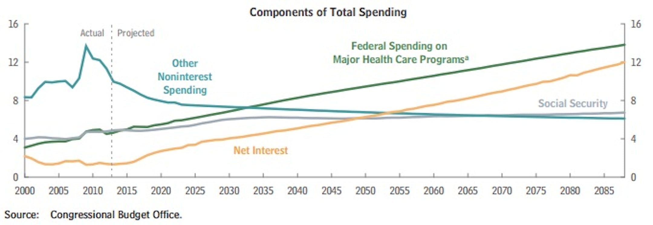 The amount of government spending is actually projected to shrink in coming decades as a percent of GDP, with the exception of three categories, and they completely tip the balance: health care spending, interest payments on the debt, and Social Security.