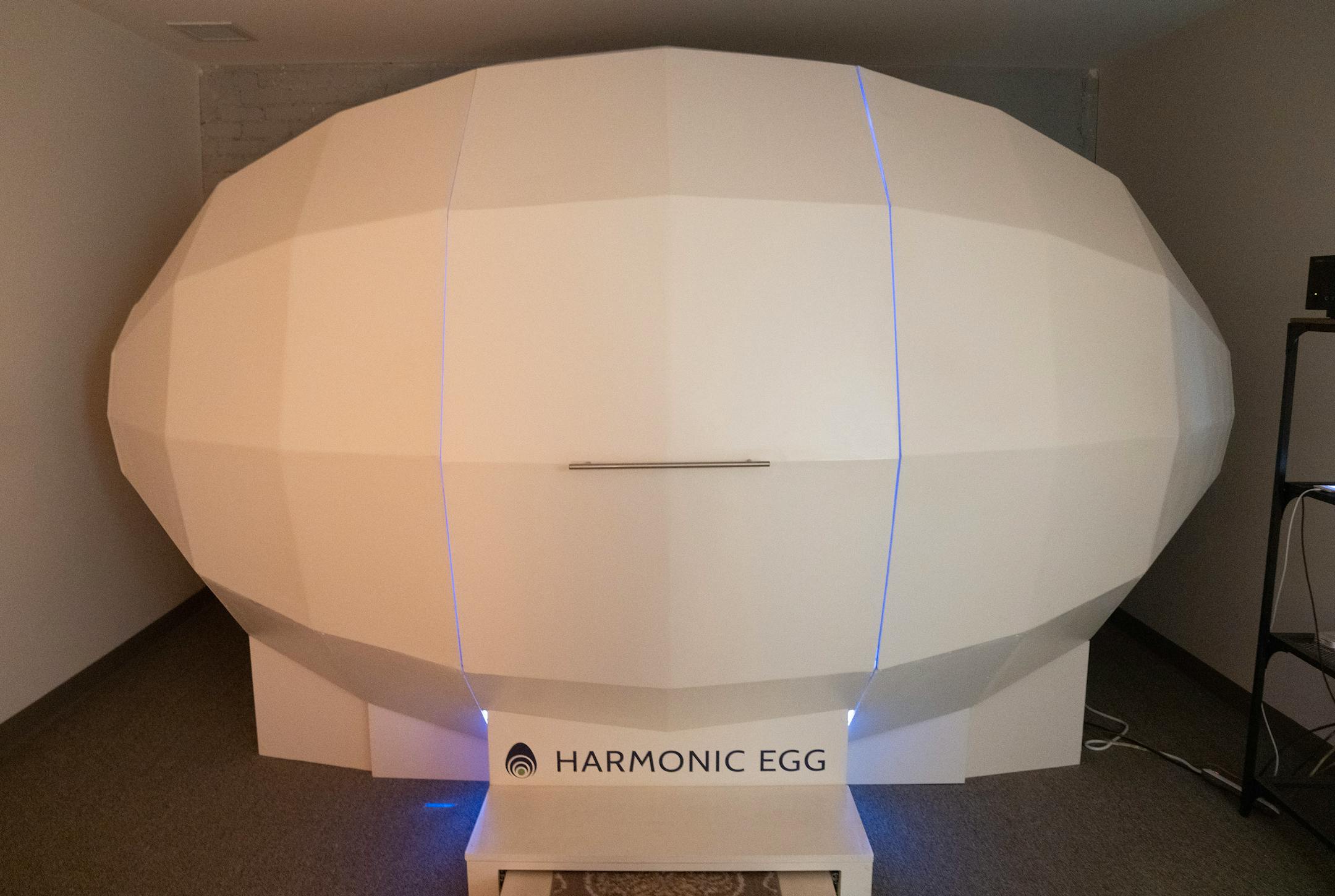 The “it” was the “Harmonic Egg,” a big, egg-shaped capsule — “a sacred geometric chamber” — that you sit in to receive “an energy healing therapy that uses vibrational frequencies to bring body and mind into harmony.”