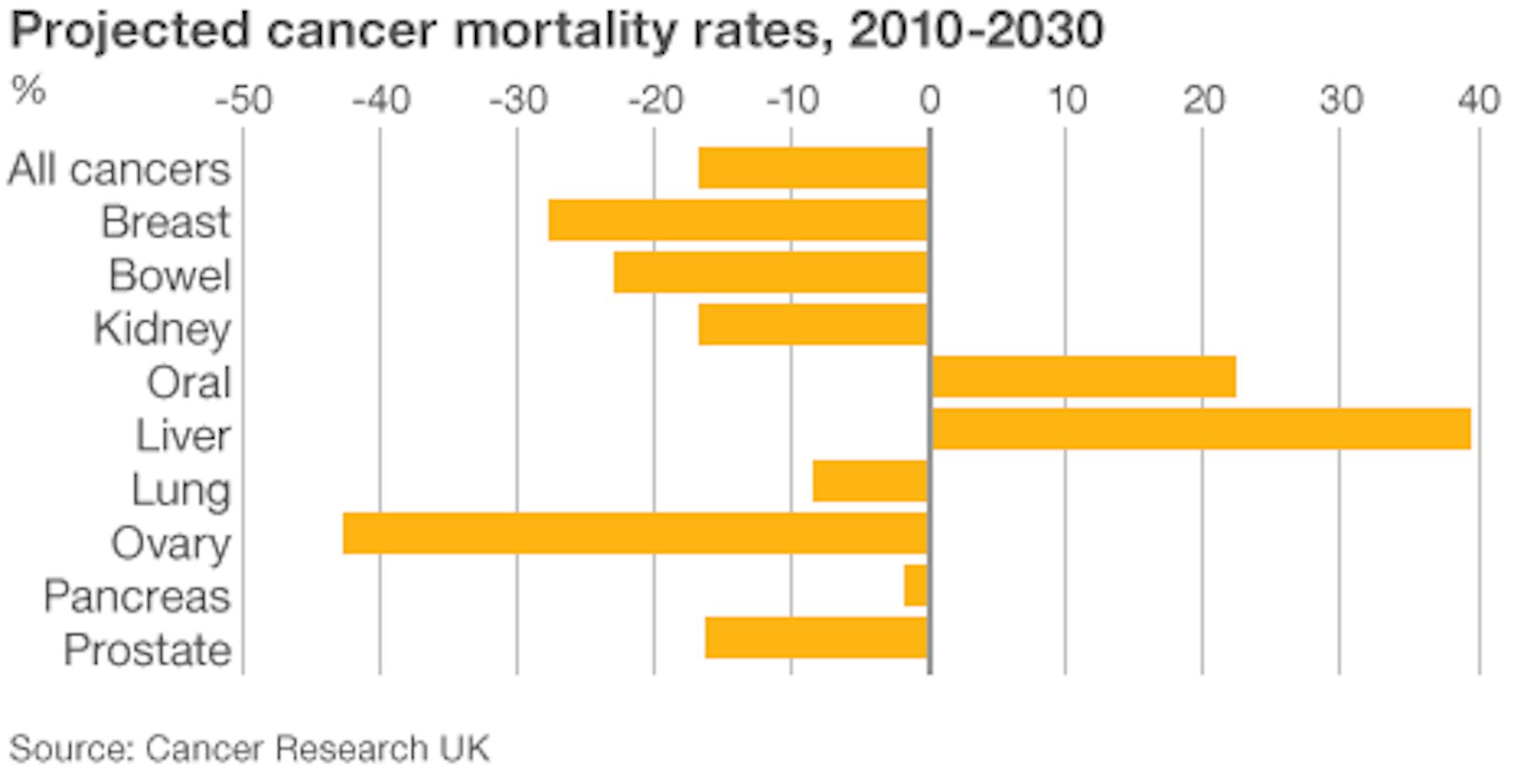 The figures also show that breast cancer in women, bowel and prostate cancer will have large reductions – falling by 28% for female breast cancer, 23% for bowel cancer and 16% for prostate cancer.
