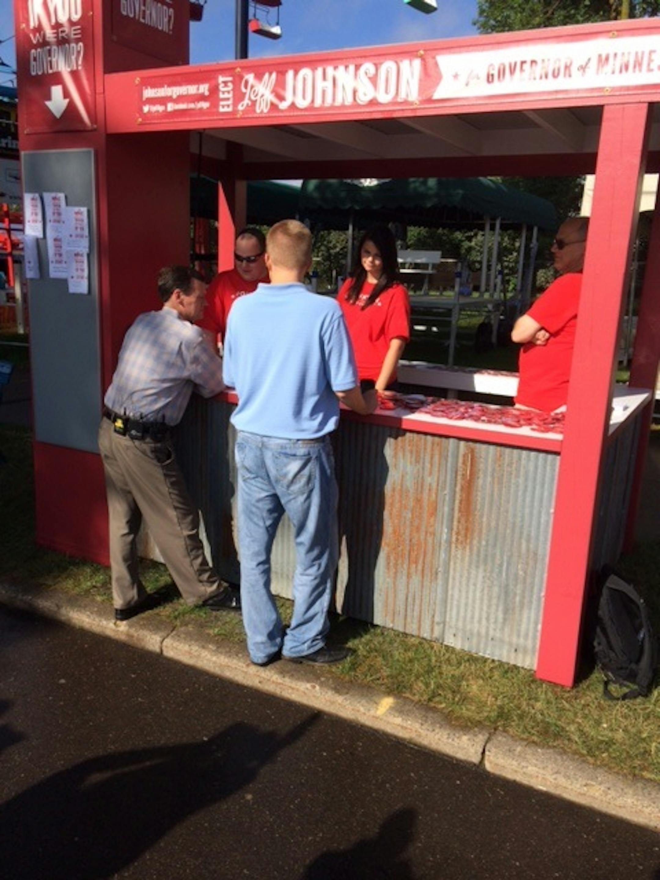 Meanwhile, Johnson kicked off the first of what he said would be at least 10 State Fair appearances with a press conference at his campaign booth. He challenged Dayton to 13 debates between now and Election Day, and suggested that two should be held at the Fair.