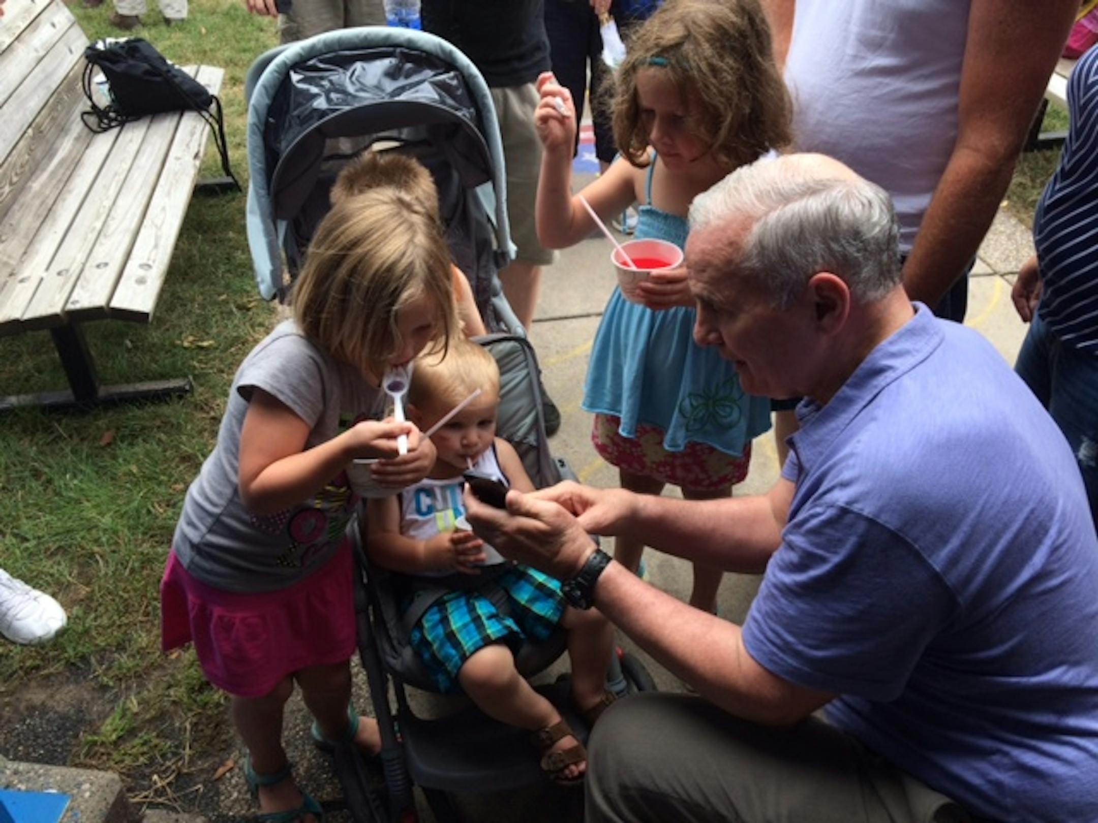 The governor shook hands, posed for pictures and chatted with supporters for about 45 minutes at the DFL booth. Later in the day he was scheduled to be doused with a bucket of ice water while live on the radio, after accepting the "ice bucket challenge" - a fundraiser for ALS that has been popular and high-profile nationwide in recent days.