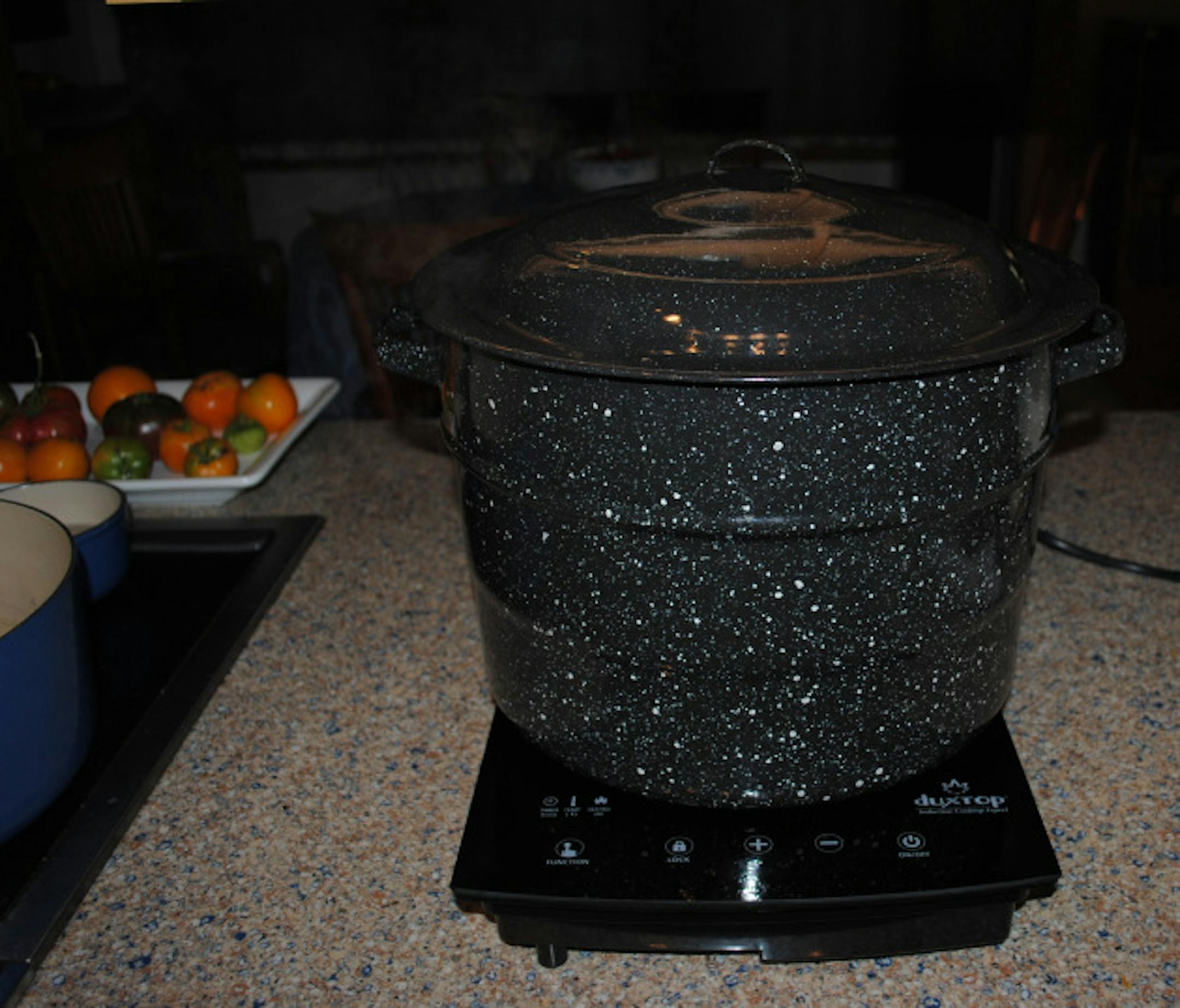 The tomatoes are heirlooms, and the canning kettle is an heirloom of another sort, handed down from my mother. But this year I gladly broke one canning tradition: the long, long wait for my slow-poke electric stove to bring gallons of water to a full boil. Canning has always turned out to be a steamy three-ring circus, with the hot plate often coming into play when I run out of burners to heat up the canning kettle, the lids and equipment, and whatever I was canning. It's made me a reluctant canner, but every year I run out of freezer space for sauces and soups, so this year I broke down and bought an induction burner. It's not one of the fancy-pants high-end models, some of which cost as much as the new stove I'd rather have, but 1,800 watts seems to do the job. It cuts the initial boil time significantly, and even more welcome, it brings the water back up to a boil nearly immediately after you put in the jars, all with far less heat pumped into the kitchen.