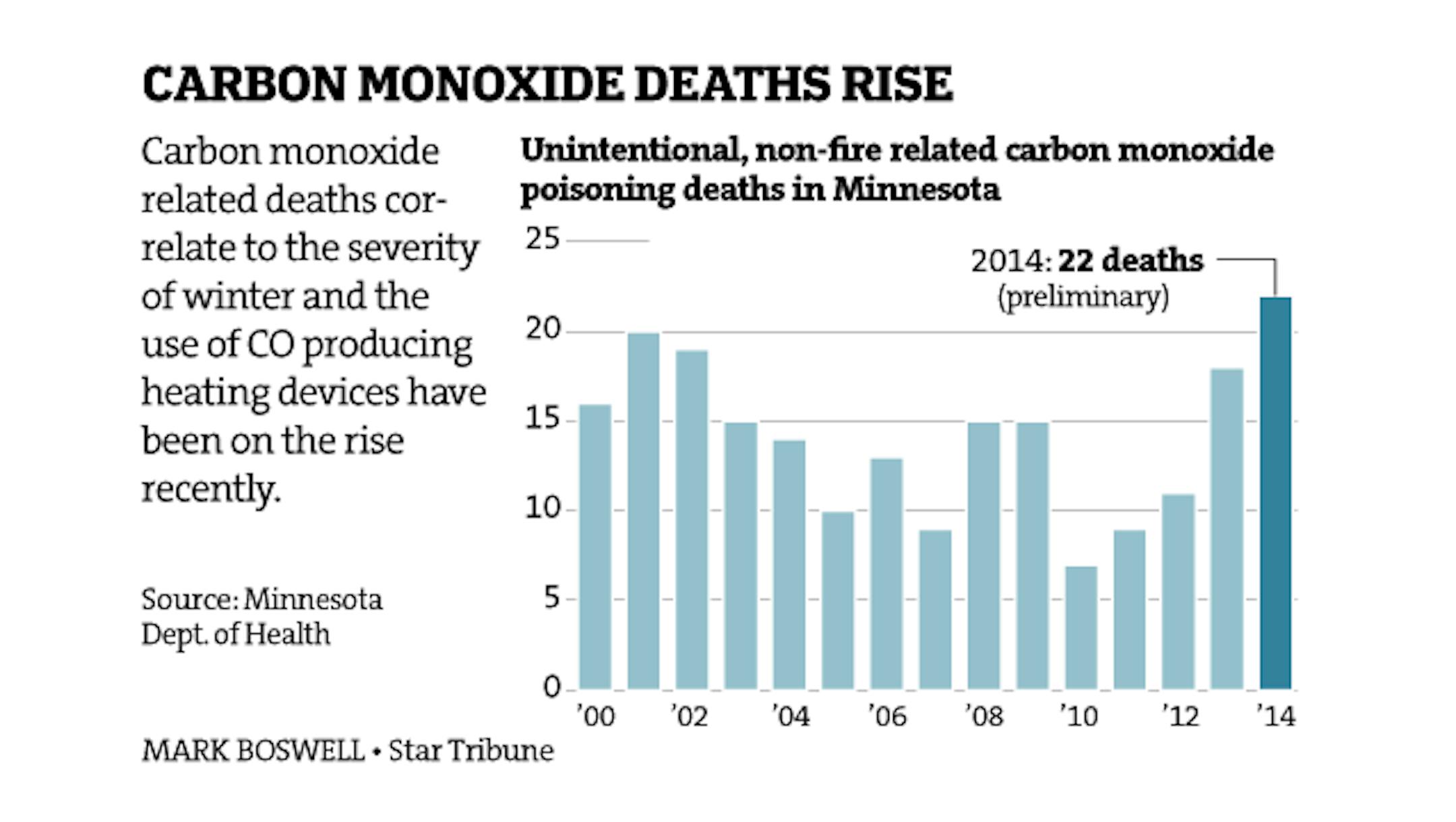Carbon monoxide deaths in Minnesota have been climbing since hitting a low of seven in 2010. "They're preventable deaths," said Jon Cole, medical director of Minnesota Poison Control System.
