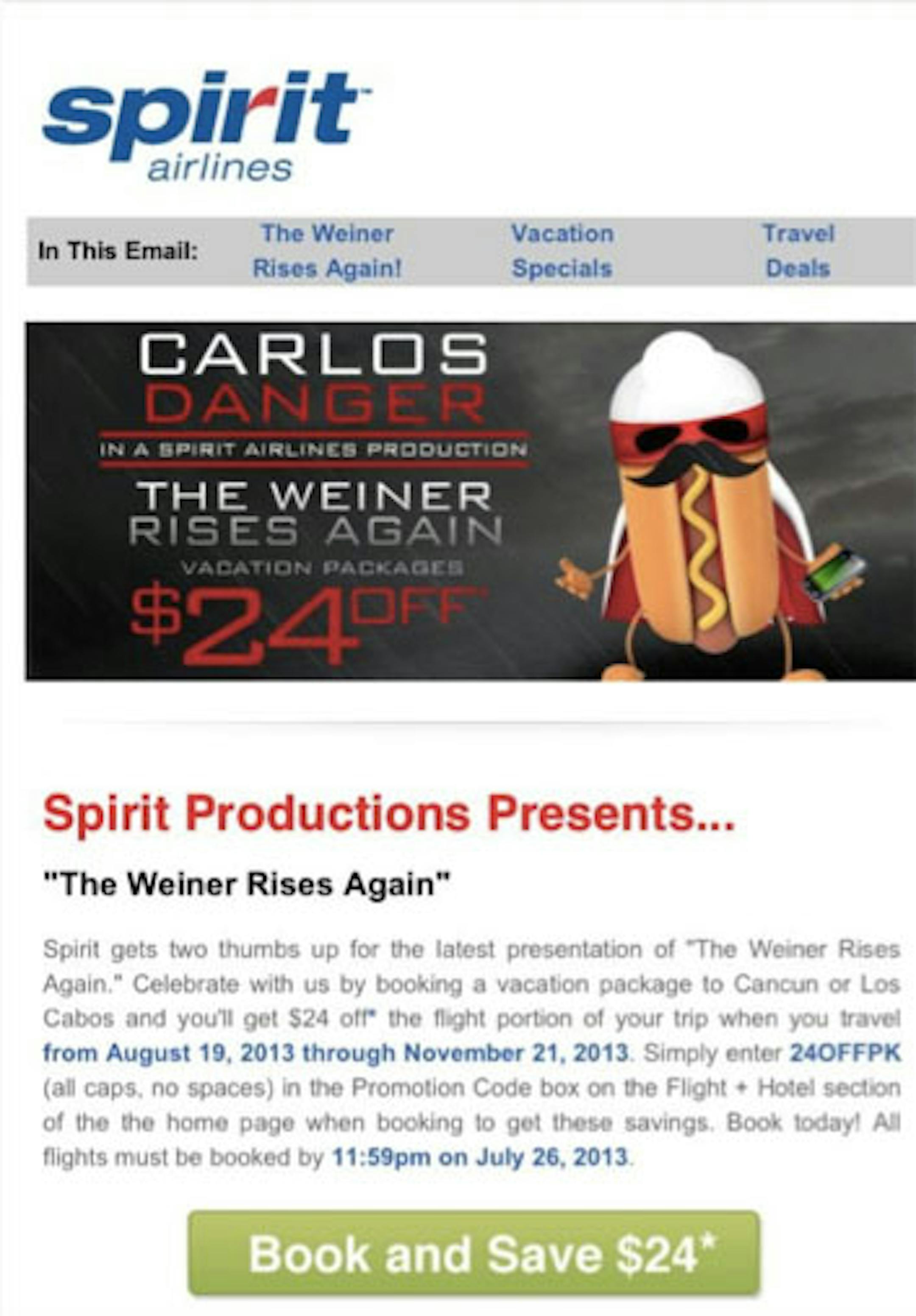Or it's the best, depending on your perspective. You know what quality some people prize in an airline? Edgy. Well, I may have to pay for each individual peanut, and there's a $5 "deplaning fee," and I was charged for "wear and tear on the seat pocket" because I took out the magazine, but whoa, those ads that referenced a squirm-inducing sex scandal! Me for Spirit airlines, I'll tell you."