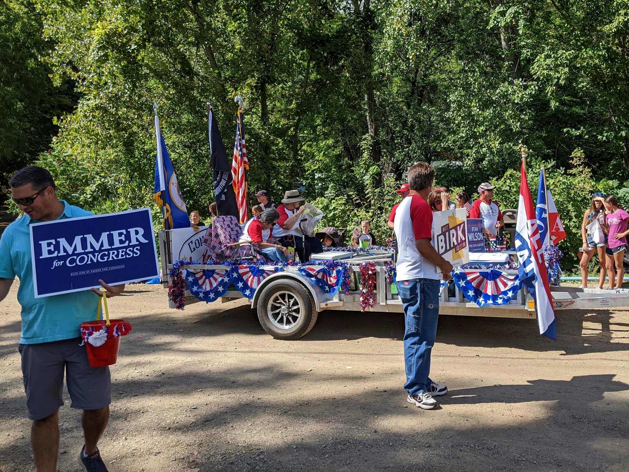 Judy and Leo Grosch wore buttons touting Scott Jensen for governor and marched in the parade for GOP state House candidate Bobbie Harder, whom the former South Dakota residents said they've known since she was a child in the neighboring state. Of Emmer, Leo Grosch said, "He's a straight-shooter ... and has a common sense approach."