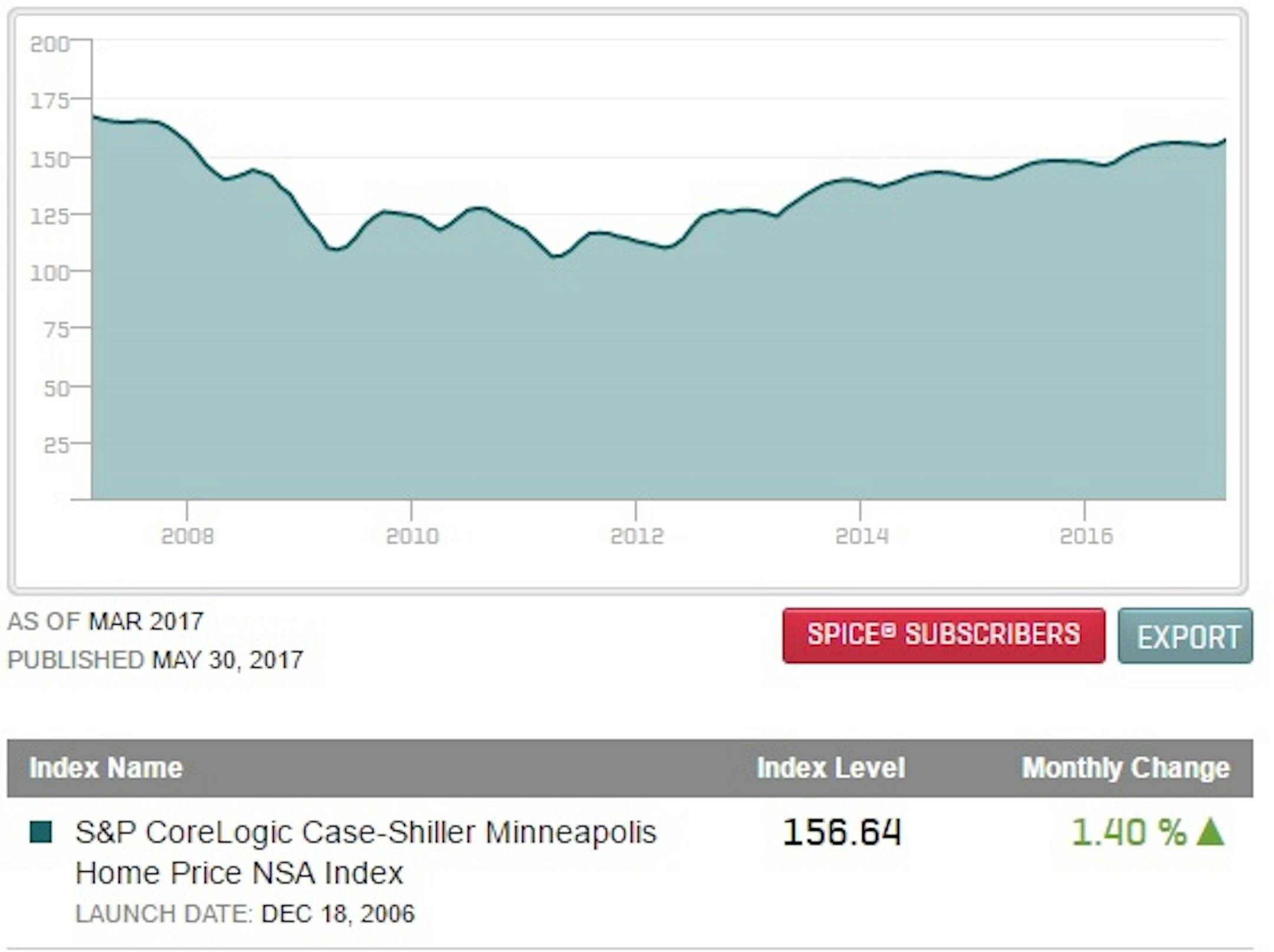 Price gains in the Twin Cities metro during the month were unusually strong and outpaced the nation. The home price index during March for the Twin Cities metro was 156.64, a 6.8-percent increase year over year and a full percentage point higher than the national average. From February to March, the Twin Cities index increased 1.4 percent, nearly twice the national average. Those gains mirror a report issued last month by the Minneapolis Area Association of Realtors, which tracks the median price of all sales that were listed and sold through the Regional Multiple Listing Services. During March, the median price of sales in the 13-county metro was $237,500, a 7-percent increase and the highest median price for any March in at least a dozen years