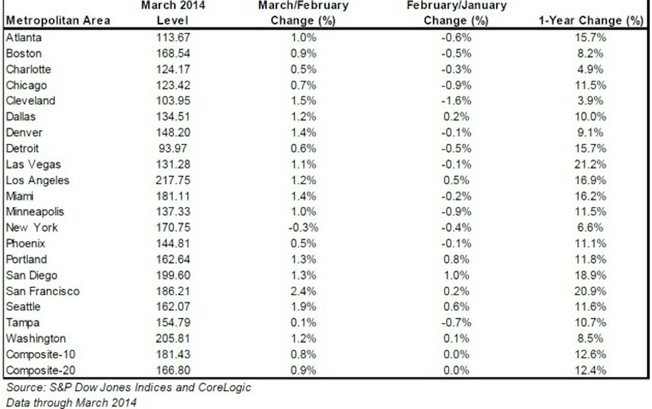 The Case-Shiller report shows that 19 of the 20 cities tracked by the composite showed positive returns in March – New York was the only city to decline. Dallas and Denver reached new index peaks.
