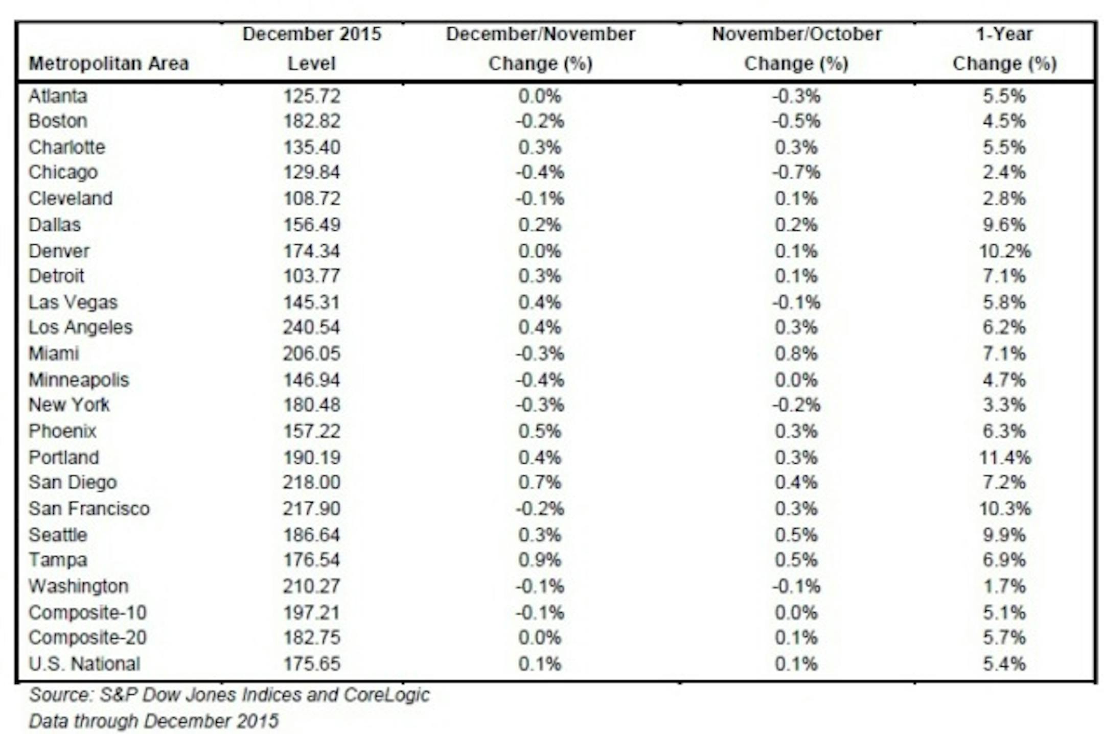 House prices in the Twin Cities metro are rising at the same rate as the rest of the country. As of December, prices were flat compared with the previous month, but were 4.7 percent higher than the previous year. That's according to the latest data from the S & P/Case-Shiller house price index, which tracks repeat sales of the same single-family houses to determine changes in house prices. Prices in Denver and San Francisco both posted gains that exceeded 10 percent, while Chicago and Cleveland both posted gains of less than 2.5 percent.