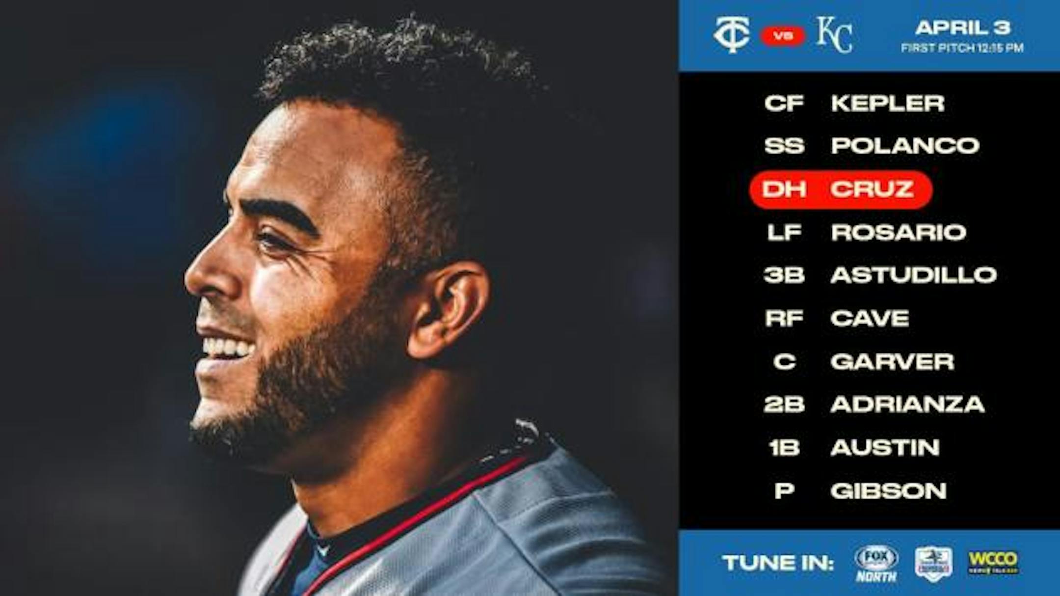 Byron Buxton (back) is out after running into the wall last night. Jonathan Schoop, Marwin Gonzalez and C.J. Cron also are getting breathers. Tyler Austin (pictured), Ehire Adrianza and Jake Cave get their first starts of the season, and Willians Astudillo is at third.