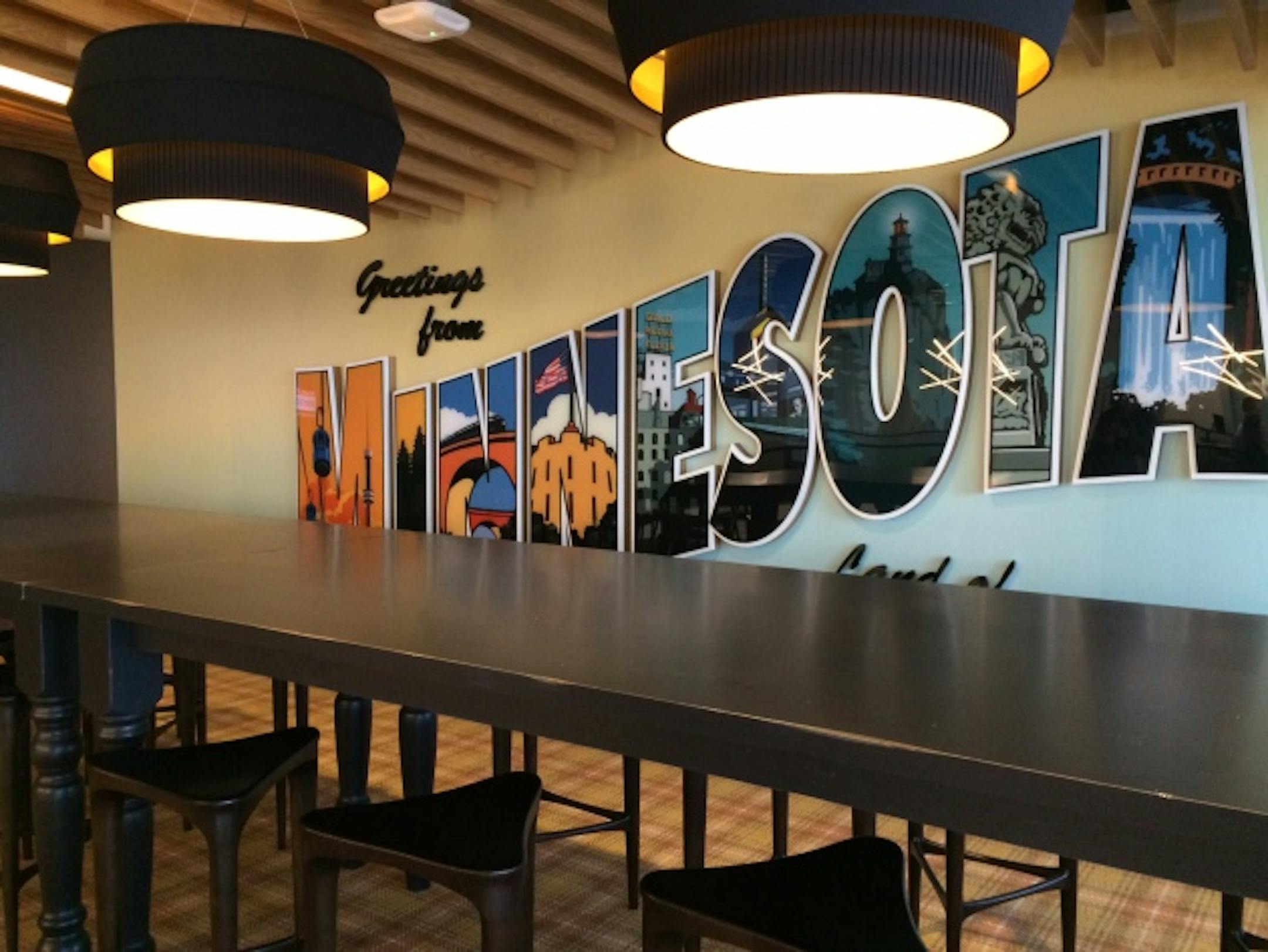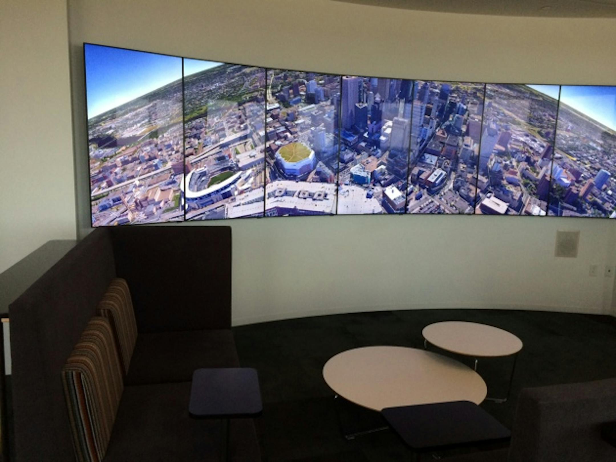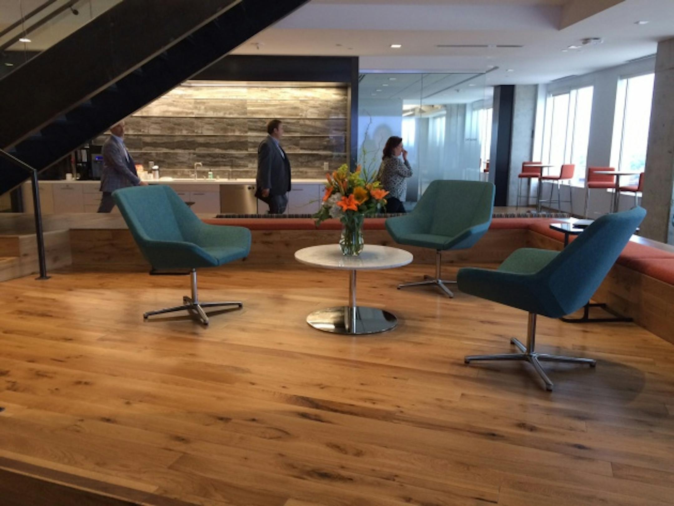 The office style is a combination of industrial and rustic with a glass, metal and wood staircase connecting both floors and kasota stone that accents walls near the elevators. There are also some technological perks such as a media wall in the lobby and a multi-screen Liquid Galaxy tool that allows workers and clients to use Google Earth to toggle on 3-D building images.